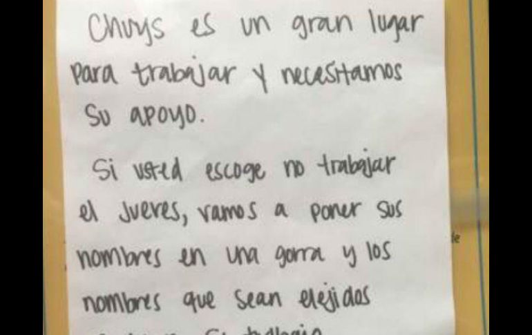 CIUDAD DE MÉXICO (16/FEB/2017).- La cadena de restaurantes Chuy's, con sede en Austin, Texas, se vio envuelta en la polémica luego de que se publicara en redes sociales la foto de una nota amenazadora colocada en su sucursal de Round Rock.La nota, escrita en español, aparentemente fue publicada en el área de empleados del restaurante: “Chuy's es un gran lugar para trabajar y necesitamos su apoyo. Si usted escoge no trabajar el jueves, vamos a poner sus nombres en una gorra y los nombres que sean elejidos (sic), perderán sus trabajos”.La foto de la nota fue publicada en Twitter por el usuario @manvsparty, pero no está claro quién la escribió y la pegó en el área de empleados del restaurante.La cadena Chuy's publicó un comunicado en su cuenta de Twitter en el que señaló que “el mensaje colocado en su sucursal de Round Rock ya fue removido”, y añadió que la administración se ha encargado de cubrir “todos los turnos para cualquier empleado que opte por participar” en las protestas en defensa de los migrantes.“No disciplinaremos ni aconsejaremos a ningún empleado que elija participar”, añadió la compañía.El vicepresidente de recursos humanos de Chuy’s, Marsha Williams, dijo que el letrero no fue publicado por el restaurante y que el autor permanece sin identificar."Apoyamos a todos nuestros empleados participando de cualquier manera que quieran", dijo Williams. "Nadie está siendo disciplinado", aseguró.Dijo que cualquier empleado que eligió tomar parte en la protesta, se le permitió participar, y todos los turnos fueron cubiertos con éxito. Reiteró que ningún empleado perderá su empleo si faltó al trabajo para participar en “Un día sin Inmigrantes".