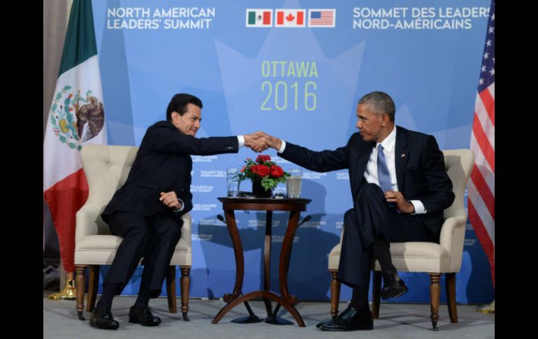 Internacional | El presidente estadounidense destaca que México y EU han sido 'socios extraordinarios' Obama invita a Peña a Washington antes de dejar la Casa Blanca El presidente estadounidense destaca que México y EU han sido ''socios extraordinarios'' Por: EFE 29 de junio de 2016 - 12:11 hs OTTAWA, CANADÁ (29/JUN/2016).- El presidente estadounidense, Barack Obama, reveló en Ottawa que ha invitado al Mandatario mexicano, Enrique Peña Nieto, a visitar Washington antes de que abandone la Casa Blanca, en enero de 2017. La invitación se produjo durante la reunión que ambos mandatarios mantuvieron en el marco de la Cumbre de Líderes de Norte que se celebra en Ottawa. Obama declaró ante las cámaras que captaban la reunión bilateral de las delegaciones de los dos países que Peña Nieto y México han sido "socios extraordinarios", y que ha invitado al Presidente mexicano "una última vez" a Washington. "Gracias por ser buenos vecinos y amigos", añadió el presidente estadounidense. Por su parte, Peña Nieto también expresó su agradecimiento a Obama "por la voluntad política" que ha demostrado durante su mandato en las relaciones con México. El Presidente mexicano también aprovechó para defender la importancia "de la integración regional", al señalar que "el aislamiento no genera prosperidad en una sociedad". "El aislamiento no es ruta. La integración lo es", zanjó el jefe de Estado mexicano. Temas Norte América Elecciones EU Estados Unidos Enrique Peña Nieto Barack Obama Relaciones Exteriores Lee También La paz siempre es una buena noticia Revelan llamada al 911 con que se reportó la muerte de Diane Keaton SMN advierte lluvias y bajas temperaturas en México esta semana Organismo internacional prevé tensión comercial a nivel global en 2026 Recibe las últimas noticias en tu e-mail Todo lo que necesitas saber para comenzar tu día Registrarse implica aceptar los Términos y Condiciones