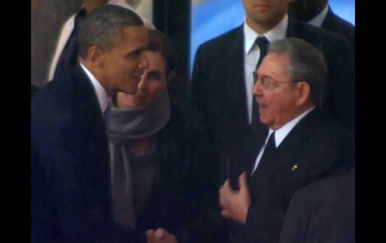 Internacional | Estados Unidos y Cuba se reúnen en el funeral del ex presidente sudafricano Obama y Raúl Castro se estrechan la mano por Mandela Estados Unidos y Cuba se reúnen en el funeral del ex presidente sudafricano Por: NTX 10 de diciembre de 2013 - 08:10 hs JOHANNESBURGO, SUDÁFRICA (10/DIC/2013).- El presidente norteamericano Barack Obama y el presidente cubano Raúl Castro se estrecharon la mano durante las honras fúnebres del líder segregacionista sudafricano Nelson Mandela. El saludo entre los líderes de dos enemigos de la Guerra Fría ocurrió durante una ceremonia centrada en el legado de reconciliación de Mandela. Obama estaba saludando a varios líderes mundiales y jefes de Estado que asisten al funeral en Johannesburgo. También estrechó la mano de la presidenta brasileña Dilma Rousseff, quien ha chocado con Obama por las supuestas actividades de espionaje de la NSA. Estados Unidos y Cuba han dado recientemente pequeños pasos hacia un acercamiento, lo que ha aumentado las esperanzas de que las dos naciones puedan estar cerca de un momento histórico en sus relaciones. Pero los escépticos advierten que los dos países han mostrado señales de acercamiento en el pasado, para regresar a las recriminaciones. Temas África Barack Obama Raúl Castro Nelson Mandela Sudáfrica Decesos de personalidades Recibe las últimas noticias en tu e-mail Todo lo que necesitas saber para comenzar tu día Registrarse implica aceptar los Términos y Condiciones