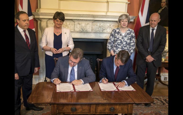 LONDRES, INGLATERRA (26/JUN/2017).- La primera ministra conservadora británica, Theresa May, logró este lunes un balón de oxígeno al firmar un acuerdo con el Partido Demócrata Unionista (DUP) noirlandés que le permite recobrar la mayoría absoluta en la Cámara de los Comunes."El DUP apoyará al gobierno conservador en las votaciones del discurso de la reina, el presupuesto, y la legislación sobre el “Brexit” y la seguridad nacional", explicó May en un comunicado.May contará con el apoyo de los 10 diputados de la formación de Arlene Foster tras el fiasco de las elecciones del 8 de junio. Los conservadores disponen de 317 de los 650 escaños de la Cámara de los Comunes, que, sumados a los del DUP, le darán más de la mitad de los diputados.Irlanda del Norte recibirá mil millones de libras adicionales como parte del acuerdo de gobierno entre su Partido Unionista Democrático (DUP) y los conservadores de la primera ministra británica Theresa May, anunció el lunes Arlene Foster, del DUP."Saludamos este apoyo financiero de mil millones de libras (mil 270 millones de dólares, mil 113 millones de dólares) en los dos próximos años", anunció Foster frente a Downing Street, tras sellar el acuerdo.Foster dijo que es "un acuerdo bueno para el Reino Unido y bueno para Irlanda del Norte", y alabó "el espíritu que ha reinado en estas negociaciones".May, por su parte, quiso tranquilizar a quienes creen que el acuerdo equivale a tomar partido entre unionistas y protestantes en Irlanda del Norte al prometer seguir gobernando "respetando los intereses de todas las partes"."Saludo este acuerdo que nos permitirá trabajar juntos en el interés de todo el Reino Unido y nos dará la certeza que necesitamos al iniciar nuestra salida de la Unión Europea", añadió May.Irlanda del Norte, sin gobiernoFoster gana así el poder de hundir o mantener viva a May y su gobierno, y, sin embargo, no logra formar gobierno en su provincia, rechazada por el Sinn Fein católico por su presunta relación con un escándalo de corrupción."Esta tarde volveré a Irlanda del Norte a seguir negociando", dijo Foster.El 29 de junio es el límite impuesto por el gobierno británico para que el DUP y el Sinn Fein formen gobierno de coalición o podría suspender la administración norirlandesa y gestionar los asuntos de la provincia directamente desde Londres.Los acuerdos de paz que, en 1998, pusieron fin a 30 años de violencia entre unionistas y republicanos en Irlanda del Norte obligan al primer partido de cada comunidad a unirse en un gobierno de coalición.Las negociaciones con el DUP crearon malestar en algunos sectores conservadores porque se trata de una formación ultraconservadora que se opone al matrimonio homosexual y al aborto, y niega el cambio climático. Con el acuerdo, May se asegura superar la moción de confianza que afronta esta semana, cuando la Cámara de los Comunes vote sobre el discurso de la reina, como se conoce al programa legislativo de los próximos dos años.Además, gana un poco de tranquilidad en el inicio de las negociaciones de divorcio con la Unión Europea, que acaban de comenzar y se prolongarán al menos un par de años.Aunque el DUP apoyó el “Brexit” en el referéndum de 2016, quiere que la frontera con Irlanda -la única terrestre entre el Reino Unido y la UE- siga abierta para no dañar a la economía local.