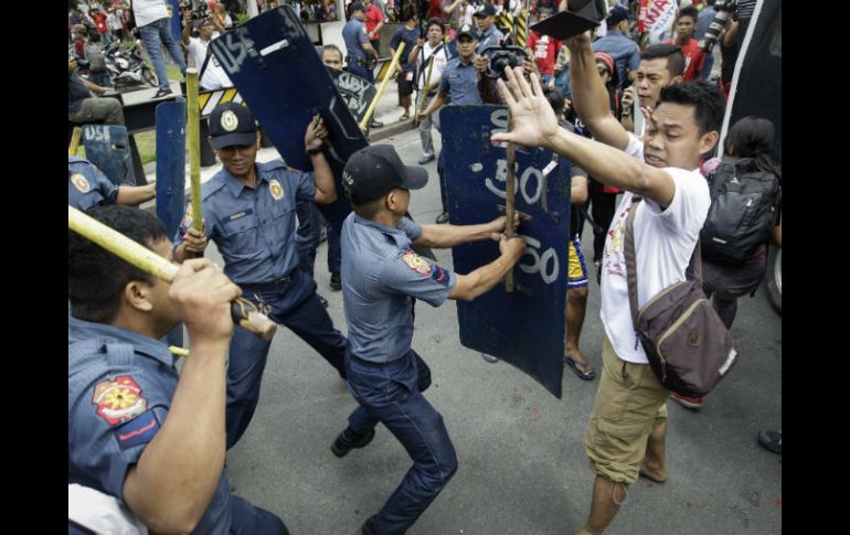 MANILA, FILIPINAS (19/OCT/2016).- Un furgón de la policía filipina embistió el miércoles contra un grupo de manifestantes, dejando varios heridos en una protesta contra Estados Unidos ante la embajada estadounidense en Manila que se tornó violenta.Al menos tres estudiantes activistas tuvieron que ser trasladados al hospital tras ser atropellados por el furgón que manejaba un policía, dijo Renato Reyes, un líder de las protestas.El furgón embistió varias veces contra la gente, manejando de forma brusca hacia delante y hacia atrás después de que los manifestantes rodearan el vehículo y empezaran a golpearlo con bastones de madera que habían arrebatado a la policía.Ante una multitud horrorizada que incluía camarógrafos y fotógrafos, la camioneta cargó de pronto hacia atrás y después avanzó dos veces en un tramo de unos 20 metros, arremetiendo contra los manifestantes y derribando a algunos sobre la calle. Unos pocos fueron atropellados, aunque lograron levantarse después.Algunos gritaron sorprendidos, mientras que otros lanzaron piedras al furgón y gritaron improperios. Un portavoz de los inconformes llamó a los policías "marionetas de los imperialistas" a través de un altavoz."No hay absolutamente ninguna justificación para eso", dijo Reyes sobre la violenta dispersión de los aproximadamente mil manifestantes. "A pesar de que el presidente prometió una política exterior independiente, las fuerzas policiales de Filipinas siguen actuando como los perros de presa de Estados Unidos".La policía empleó gases lacrimógenos y detuvo al menos a 23 manifestantes que rompieron un perímetro de la policía antimotines y arrojaron pintura roja contra los agentes y un sello del gobierno estadounidense en la entrada al complejo de la embajada, situada junto a la costa.Un camión de bomberos empleó las mangueras de agua para repeler a los manifestantes, pero la gente se hizo con la manguera y se enfrentó a los policías sobrepasados con rocas y pintura roja. Tras atravesar el perímetro policial, escribieron con pintura roja "tropas de Estados Unidos fuera ya" y otros lemas en la alta cerca de la embajada.Los manifestantes, entre los que había estudiantes, trabajadores y miembros de tribus, exigían el fin de la presencia de tropas estadounidenses de visita en el país y apoyaban la petición del presidente, Rodrigo Duterte, de aplicar una política exterior que no dependa de Estados Unidos, antiguo aliado del país.Los activistas procedían del gran colectivo de izquierdas Bayan (Nación), que organiza desde hace décadas protestas regulares contra Estados Unidos ante la embajada, la mayoría pacíficas.Duterte se encontraba de visita oficial en China, donde intentará reparar las relaciones bilaterales, afectadas durante el gobierno de su predecesor por disputas territoriales en el mar de la China Meridional. Duterte también intentará expandir el comercio y las inversiones bilaterales, así como solicitar financiamiento para cruciales proyectos de infraestructura.En medio de una tensa relación con Washington, Duterte ha intentado tender puentes con China y Rusia, lo que ha llevado incertidumbre a la larga alianza entre Filipinas y Estados Unidos.Sin embargo, los manifestantes también se oponían a los esfuerzos del presidente por acercarse a China. "Filipinas no recibirá dictados de otros, ya sean Estados Unidos o China", afirmaron en un comunicado.La Policía Nacional filipina no hizo declaraciones el miércoles en un primer momento.Los episodios violentos se produjeron en medio de un creciente escrutinio internacional sobre Duterte y la policía por su supuesto papel en la muerte de miles de sospechosos relacionados con las drogas, dentro de la campaña del presidente contra las drogas ilegales.