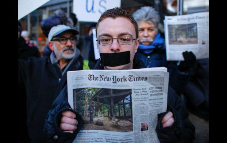 NUEVA YORK, ESTADOS UNIDOS (26/FEB/2017).- Unas 250 personas se manifestaron este domingo en Nueva York para apoyar al diario The New York Times y otros medios de comunicación, frente a los ataques del presidente estadounidense Donald Trump. A pesar de que Nueva York, bastión demócrata, encadena las manifestaciones antiTrump desde la victoria del magnate inmobiliario, es la primera vez que se organiza una concentración para apoyar a la prensa, tras una semana marcada por los ataques de la Casa Blanca a algunas de las organizaciones más poderosas del país como el periódico neoyorquino, Los Angeles Times o CNN. La Casa Blanca prohibió el viernes el acceso a esos medios a una sesión informativa diaria que ofrece el portavoz, Sean Spicer. Bajo las frías temperaturas, los manifestantes se reunieron ante la entrada de la torre del The New York Times, cerca de Times Square, con pancartas que mencionaban la primera enmienda de la Constitución estadounidense sobre la libertad de prensa, y bandas adhesivas en la boca para simbolizar a los medios amordazados."Cada vez que una persona autoritaria o dictadores toman el control, siempre ahogan a la prensa, es la primera cosa que hacen", afirmó Donna Marie Smith, una profesora retirada abonada al diario estrella de Nueva York "desde hace más de 40 años"."La democracia no puede funcionar sin una prensa libre e independiente, y es precisamente lo que esta administración intenta hacer: callarles. Pero no permitiremos que eso suceda", declaró de su lado Betsy Apple, una abogada especializada en la defensa de los derechos humanos. cat/are/lb/spc