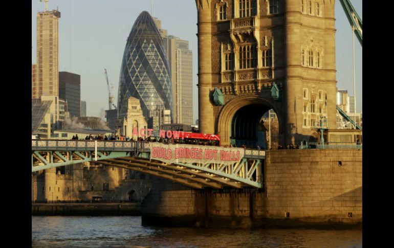 LONDRES, INGLATERRA (20/ENE/2017).- Cientos de activistas se manifestaron en esta ciudad bajo la consigna "Construyamos puentes no muros" (Bridges not walls) contra las políticas del presidente electo Donald Trump quien hoy rinde protesta en Washington. Un grupo de mexicanos extendió esta mañana la bandera tricolor en el puente de Westminster donde una pancarta gigante leía "Los migrantes son bienvenidos". Entretanto, en el emblemático puente de la Torre de Londres (Tower Bridge) los organizadores colgaron un cartel de 25 metros con la leyenda "Bridges not Walls" (Puentes no muros). Los manifestante buscan enviar un mensaje claro contra la propuesta de Trump de construir un muro en la frontera entre México y Estados Unidos. Los nueve puentes del Río Támesis -desde Tower Bridge, Waterloo, Westminster y hasta Vauxhall- lucen mantas con las consignas la "solidaridad vence fronteras", "bienvenidos refugiados", y "no hay planeta B." La portavoz de "Bridges Not Walls", Nona Hurkmans, afirmó que la movilización es una muestra de solidaridad hacia grupos que han sido atacados en Estados Unidos y el Reino Unido -a partir del referendo sobre la salida de Londres de la Unión Europea. "Nos estamos manifestando contra los políticos de extrema derecha que llevan un mensaje de odio y división como es el caso de Nigel Farage (ex-líder del Partido por la Independencia) y otros grupos que han sido atacados en Estados Unidos", señaló. Decenas de pancartas fueron colocadas en espacios públicos del centro de esta ciudad a unas horas de la ceremonia de toma de posesión del presidente Trump. Mañana grupos de mujeres convocaron a una marcha que saldrá a mediodía de la embajada de Estados Unidos hacia la plaza de Trafalgar para protestar contra las políticas discriminatorias y en favor de los valores de libertad y democracia.