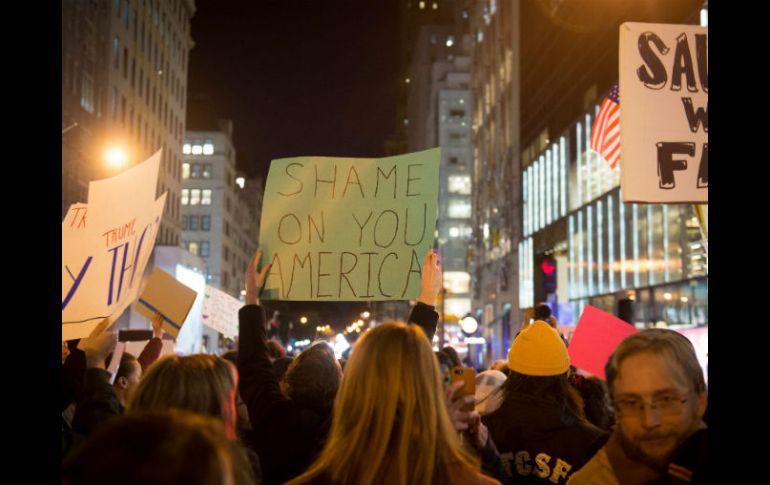 NUEVA YORK, ESTADOS UNIDOS (13/NOV/2016).- Numerosos inmigrantes, sus defensores y otras personas opuestas al presidente electo Donald Trump escenificaron el domingo una nueva jornada de protestas, pronunciándose contra las deportaciones y otras medidas apoyadas por el futuro gobernante.Los participantes en las movilizaciones en Manhattan portaban carteles que decían en inglés y español "Hate won't make us great" (El odio no nos hará grandes) ”en referencia al lema de campaña de Trump de que él hará que Estados Unidos sea grande de nuevo” y coreaban "¡estamos aquí para quedarnos!".Más de mil personas participaron en la marcha que comenzó a media tarde y se prolongó hasta la noche.La manifestación fue la más reciente dentro de las jornadas consecutivas de protestas que han tenido lugar en diversas ciudades de Estados Unidos, aunque también en otras partes del mundo.Centenares de manifestantes que marcharon el domingo por el ayuntamiento en Filadelfia y después por la calle Market hasta el Independence Mall mostraban carteles y gritaban "¡Donald Trump tiene que irse!" y "Este es el aspecto que tiene la democracia".En Los Ángeles, algunos cientos de personas se reunieron afuera de la sede de la cadena CNN en la ciudad, mientras que en San Francisco también centenares de personas, incluidas muchas familias con niños, marcharon desde el parque Golden Gate hasta Ocean Beach mientras gritaban a coro "¡El amor vence al odio!". El sábado, unas ocho mil personas marcharon por el centro de la ciudad.El domingo, aproximadamente 800 personas se desplazaron por la capital estatal, Sacramento, y centenares más formaron una cadena humana alrededor del perímetro de casi 5.6 kilómetros (3.5 millas) del lago Merritt de Oakland.Quienes se reunieron en el lago se tomaron de las manos y gritaron a coro "Rechazamos al presidente electo".En Oregon, la policía dijo que arrestó a 71 personas el sábado en la noche y a primeras horas del domingo durante las protestas anti-Trump en el centro de Portland.La Oficina de Policía de Portland dijo que extendió citatorios a la mayoría de los inconformes por alteración del orden público y desobedecer a un agente.En otros países también ha habido protestas contra Trump.En la Ciudad de México, un grupo se reunió frente al monumento Ángel de la Independencia y expresó sus preocupaciones por una posible ola de deportaciones. Un maestro dijo que eso aumentaría la "intranquilidad" que ya existe en México.En Berlín, unas 300 personas protestaron por la elección de Trump como el próximo presidente de Estados Unidos frente a la embajada norteamericana, próxima a la histórica Puerta de Brandenburgo.La mayoría de las protestas han sido pacíficas. Pero en Portland, Oregon, un hombre fue herido de bala el sábado por la mañana durante una confrontación. La policía arrestó a dos adolescentes por el incidente.