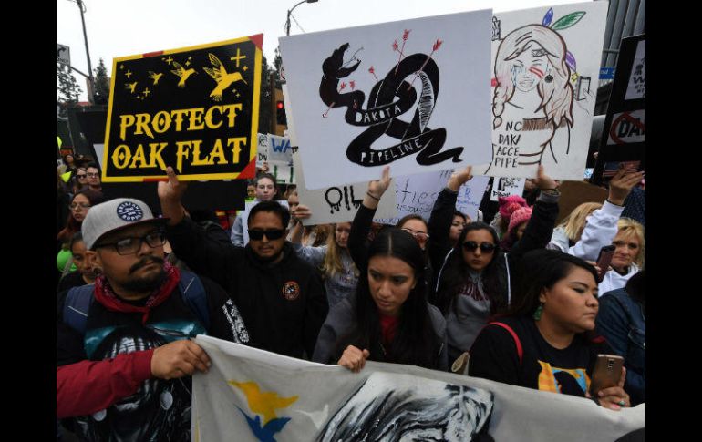 LOS ÁNGELES, ESTADOS UNIDOS (05/FEB/2017).- Cientos de manifestantes tomaron el domingo calles del centro de Los Ángeles para protestar contra el decreto del presidente Donald Trump para acelerar los proyectos de los oleoductos Dakota Access y Keystone XL.Los manifestantes portaban carteles y entonaban cánticos mientras se concentraban en la Plaza Pershing, desde donde comenzaron a caminar aproximadamente 1.5 kilómetros (una milla) para asistir a un mitin en el Edificio Federal Edward Roybal.La policía dijo que la reunión era pacífica y que no había reportes de disturbios o arrestos.Los opositores a los proyectos dicen que el oleoducto Dakota Access, con costo de tres mil 800 millones de dólares, amenaza el suministro de agua y sitios sagrados de la tribu sioux Standing Rock.El presidente Trump ha señalado que quiere que avance el Dakota Access y el oleoducto Keystone XL, el cual conectaría campos petroleros de Canadá con refinerías en la costa estadounidense en el Golfo de México.