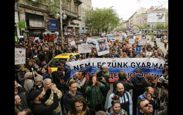 BUDAPEST, HUNGRÍA (22/ABR/2017).- Miles de húngaros participaron el sábado en una marcha de sarcasmo a la que bautizaron como "La marcha de la paz a favor del gobierno, a favor de Rusia y en contra de todo lo demás".La marcha organizada por el satírico Partido del Perro de las Dos Colas busca mofarse de la realidad actual en Hungría, como por ejemplo los estrechos lazos del gobierno con Rusia, y la campaña oficial en contra de las propuestas proinmigrantes del inversionista George Soros.La vendetta del gobierno contra Soros ha desembocado en una ley que podría llevar al cierre de la Universidad de Europa Oriental en Budapest, una institución que cuenta con el financiamiento de Soros.En tono de broma, el líder del partido Gergo Kovacs dijo que aunque hay que celebrar que los húngaros no pueden usar el euro, es lamentable que no puedan usar la moneda de Rusia, el rublo.Otros carteles que se veían en la marcha: "No más de ese disparate que llaman democracia" y "No queremos que la UE siga llenándonos de dinero".