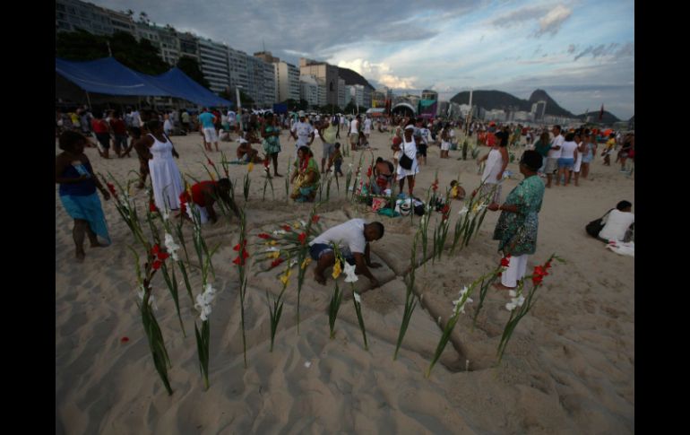Internacional | Se lanzarán también 34 mil cohetes desde 11 embarcaciones ancladas Río de Janeiro recibe el 2015 de blanco Se lanzarán también 34 mil cohetes desde 11 embarcaciones ancladas Por: AFP 31 de diciembre de 2014 - 12:45 hs Muchos cariocas harán sus ofrendas de flores a Yemanjá, la diosa del mar en el Candomblé, el culto afrobrasileño. EFE / M. Sayao RÍO DE JANEIRO, BRASIL (31/DIC/2014).- Vestidos en su mayoría de blanco, como dicta la tradición, más de dos millones de personas recibirán el 2015 en la mítica playa de Copacabana de Río de Janeiro, con un impresionante show pirotécnico que abre además las celebraciones por el 450º aniversario de esta 'Cidade Maravilhosa'. El termómetro marca 40ºC y la playa está a reventar desde temprano. Algunos simplemente aprovechan para tomar los últimos rayos de sol de 2014, mientras que otros comienzan a reservar un buen lugar en la arena para no perder detalles del espectáculo de fuegos artificiales. Victor Ruibal (24 años) y una decena de familiares y amigos instalaron desde las 11:00h (13:00h GMT) dos toldos blancos. Y ahí se quedará hasta la medianoche este grupo que viajó de Sao Paulo (sudeste) para su primer "Reveillon" carioca. "Todos estaremos vestidos de blanco", dijo Ruibal, antes de ser interrumpido por Cida Salgado (50 años). "Yo me vengo de amarillo, un dinerito nunca cae mal", lanzó con una carcajada. Además del blanco, que representa la paz, los cariocas optan por vestir de amarillo o dorado para la prosperidad o rojo por el amor. Algunos visten de blanco pero llevan ropa interior de uno de estos otros colores... Doble propósito. Unos 34 mil cohetes que suman 24 toneladas serán lanzados a medianoche desde 11 embarcaciones ancladas a 400 metros de la playa por motivos de seguridad. Este año, por primera vez, se podrán ver cifras y letras proyectadas en el cielo con la leyenda 'Rio 450' por los años que cumple la ciudad. Antes del espectáculo, será proyectado en pantallas gigantes un saludo del Papa Francisco desde el Vaticano. Y luego, con el 2015 en el calendario, muchos cariocas harán sus ofrendas de flores a Yemanjá, la diosa del mar en el Candomblé, el culto afrobrasileño. Aunque Marinete de Almeida (61 años) prefiere hacerlo antes. "En la noche es casi imposible. Estoy buscando un hueco para entrar al mar y colocar las flores", dijo viendo a la playa colmada. "Quiero pedir por salud primero que nada, porque con salud se puede conseguir dinero, salud, todo", precisó esta mujer morena con un ramo de flores amarillas, blancas y rojas en mano. Muchos cariocas también saltan siete olas pidiendo deseos o comen 12 uvas con el mismo propósito: un voto por cada fruto. Comer lentejas da además "buena suerte y prosperidad" durante todo el año. No así el pollo, que debe evitarse "porque hace retroceder", según supersticiones locales. Patrick Tual (41 años) es francés y se cuenta entre los 816 mil turistas que recibirán el año en Copacabana. ¿Sus planes para la noche? "Cena con amigos... ¡y después a la playa!". Más de mil 800 agentes municipales y mil 700 policías garantizarán la seguridad a lo largo de los 4.5 km de la playa de Copacabana. Temas América Latina Brasil Año Nuevo Lee También FIL Guadalajara recibe nuevas voces y reconocidas autoras en Destinação Brasil La Granja VIP Brasil: Gaby Spanic queda fuera de reality tras cachetear a concursante Molotov, tres décadas sin bajar el volumen Rosalía anuncia la fecha de estreno de su nuevo álbum Recibe las últimas noticias en tu e-mail Todo lo que necesitas saber para comenzar tu día Registrarse implica aceptar los Términos y Condiciones