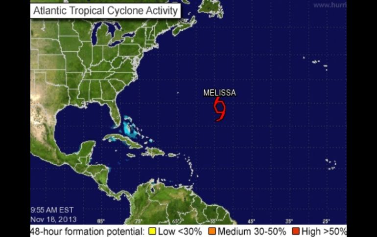 Internacional | El oleaje elevado afecta ya las costas de Puerto Rico, República Dominicana y Haití Se forma tormenta tropical Melissa en el Atlántico El oleaje elevado, uno de los efectos del fenómeno, afecta ya las costas de Puerto Rico, República Dominicana y Haití Por: EL INFORMADOR 18 de noviembre de 2013 - 10:48 hs Imagen satelital que muestra la ubicación del fenómeno proporcionada por el Centro Nacional de Huracanes de EU. ESPECIAL / MIAMI, ESTADOS UNIDOS (18/NOV/2013).- El Centro Nacional de Huracanes (CNH) de Estados Unidos informó que se formó la tormenta tropical Melissa al sureste de las islas Bermudas, en aguas centrales del Atlántico. En el reporte explican que las grandes olas provocadas por la tormenta ya afectan partes de las islas de Barlovento, Puerto Rico, República Dominicana y Haití, así como el sureste de las Bahamas. Sus vientos sostenidos tienen una velocidad máxima de 80 kilómetros por hora (50 millas por hora) y se espera aumenten. Melissa se encuentra a unos mil 120 kilómetros al este-suroeste de las islas Bermudas y se mueve al noroeste a una velocidad de unos 15 kilómetros por hora. Previsión a próximas horas Los meteorólogos del CNH, con sede en Miami, vaticinan que Melissa mantendrá su trayectoria durante el lunes y para el martes experimentará un progresivo y lento giro hacia el norte, seguido de un cambio hacia el noreste el miércoles. Se espera un fortalecimiento adicional del sistema en las próximas 48 horas hasta que "se transforme en un amplio fenómeno tropical", que permanecerá en aguas del Atlántico los próximos dos días, agregó el boletín. EL DATO En lo que va de la temporada de huracanes en la cuenca atlántica, que comenzó el 1 de junio y finaliza el próximo 30 de noviembre, se han formado ya 11 tormentas tropicales, incluida Melissa, de las que dos se convirtieron en huracanes. Con información de AP y EFE Temas Norte América Océanos Tormenta tropical Lee También Tormenta tropical "Raymond" mantiene en alerta a estos estados el fin de semana Chivas y América calientan en redes el Clásico Nacional de la Fecha FIFA ALERTA en Jalisco por formación de ciclón "Raymond" ¿Cuándo la tormenta tropical "Raymond" estará cerca de Jalisco? Recibe las últimas noticias en tu e-mail Todo lo que necesitas saber para comenzar tu día Registrarse implica aceptar los Términos y Condiciones