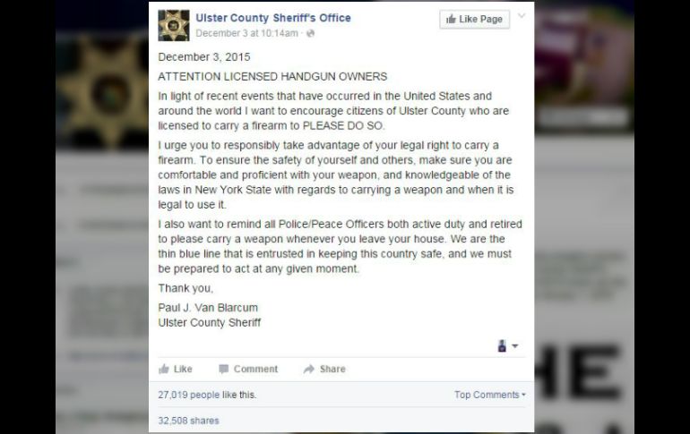 Internacional | Paul J. Van Blarcum indica que se puede usar un arma sin romper la ley Sheriff norteamericano 'invita' a portar armas Paul J. Van Blarcum indica que se puede usar un arma sin romper la ley Por: EL INFORMADOR 5 de diciembre de 2015 - 14:02 hs El comunicado ha sido compartido en más de 32 mil ocasiones y recibido más de tres mil comentarios. FACEBOOK / Ulster County Sheriff's Office GUADALAJARA, JALISCO (05/DIC/2015).- "En vista de los eventos recientes en Estados Unidos y al rededor del mundo, quiero invitar a todos los ciudadanos del condado de Ulster a cargar con un arma de fuego". Así inicia un comunicado que fue enviado por el Sheriff Paul J. Van Blarcum del condado de Ulster en Nueva York en el que asegura que, portando armas, lograrán mantenerse seguros. Además, en la publicación realizada a través de la página de Facebook de la policía de Ulster se recuerda que, el portar armas, es un derecho legal: "Los aliento a que, de manera responsable, tomen ventaja de su derecho legal a cargar un arma de fuego. Para asegurar su tranquilidad y la de los otros elige un arma con la que te sientas seguro y confortable y claro, conoce las leyes que te permiten usarla sin romper las mismas. También invito a los cuerpos de policía y de paz tanto en servicio como retirados a que carguen sus armas en cualquier momento que salgan de casa. Somos la pequeña línea azul que mantiene este país seguro y tenemos que estar preparados para actuar en cualquier momento. Gracias". El texto ha sido compartido en más de 32 mil ocasiones y recibido más de tres mil comentarios tanto positivos como negativos, aquí algunos de ellos: - Stephen Cooke: Por fin, alguien con buen juicio. - Cathy Sanchez Duvivier: Considerando cuántos actos de barbarie hemos presenciado en nuestro país con armas compradas de manera legal, no puedo creer que el sheriff escriba una cosa tan irresponsable. - Melissa Megan: Esto no me hace sentir más segura, pero sí me parece una manera irresponsable de colaborar al pánico y mantener a las personas desconfiando de los demás. - Steven Meyer: Me siento orgulloso del Sheriff. - Rober Bump: Por fin, un oficial que habla con la verdad y se preocupa por sus ciudadanos. Cabe recordar que, en las últimas semanas, Estados Unidos ha sido víctima de dos tiroteos. El primero en una clínica de paternidad en Colorado, el último sucedió a penas esta semana en San Bernardino, California en donde murieron 14 personas. En ambos casos las armas fueron adquiridas de manera legal. EL INFORMADOR/ PATRICIA GALLARDO Temas Norte América Estados Unidos Facebook Control de armas Lee También Reportan dos muertos por lluvias en México Trump amenaza con "incremento masivo" de aranceles a China José Jerí asume como presidente de Perú Congreso de Perú destituye como presidenta a Dina Boluarte Recibe las últimas noticias en tu e-mail Todo lo que necesitas saber para comenzar tu día Registrarse implica aceptar los Términos y Condiciones