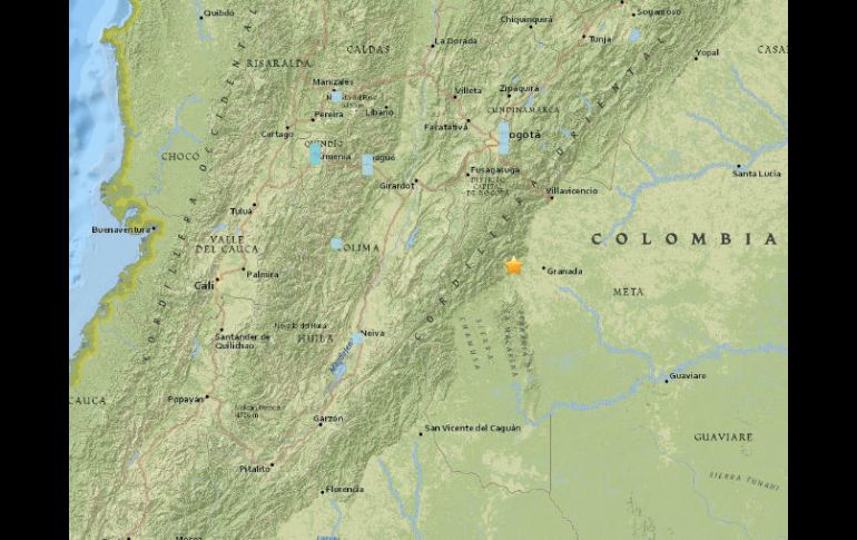 BOGOTÁ, COLOMBA (02/JUL/2017).- Un sismo con magnitud preliminar de 5.1 se registró el domingo en la región central de Colombia, sin que se presentaran reportes inmediatos de lesionados o víctimas.El Servicio Geológico de Estados Unidos informó que el temblor ocurrió a las 14:26 locales (1926 GMT) con epicentro en las cercanías del municipio Lejanías del departamento de Meta, a unos 74 kilómetros (46 millas) al suroeste de la ciudad de Villavicencio, en el centro del país. Tuvo una profundidad de 49.5 kilómetros.La Unidad Nacional de Desastres de Colombia indicó en Twitter que no se tenían informes inmediatos de daños ni de heridos en los departamentos de Meta, Tolima, Quindío, Cundinamarca y Guaviare.El sismo también se sintió en la ciudad de Bogotá.