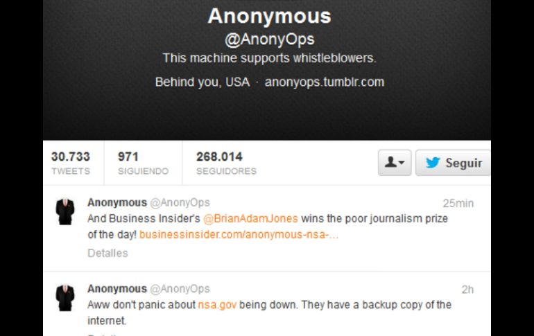 Internacional | El organismo, conocido por sus actividades de espionaje, investiga los motivos Sitio web de NSA fuera de servicio El organismo, conocido mundialmente por sus actividades de espionaje, investiga los motivos Por: EL INFORMADOR 25 de octubre de 2013 - 18:17 hs Anonymous publica un tuit donde dice 'No se asusten por la caída de nsa.gov. Tienen una copia de seguridad de la internet'. ESPECIAL / WASHINGTON, ESTADOS UNIDOS (25/OCT/2013).- El sitio de internet de la Agencia Nacional de Seguridad (NSA) estadounidense quedó fuera de servicio el viernes y el organismo, conocido mundialmente por sus actividades de espionaje, dijo que estaba investigando los motivos. "Estamos investigando esto", dijo la portavoz de la NSA, Vanee Vines, sin dar más detalles. En Twitter, las especulaciones sobre los motivos de la caída del sitio nsa.gov se multiplicaban. El grupo de hackers Anonymous bromeó sobre lo sucedido en un tuit, pero sin decir si había participado. "No se asusten por la caída de nsa.gov. Tienen una copia de seguridad de la internet", escribió. La NSA ha estado en el centro del debate público luego de que el exanalista Edward Snowden, asilado en Rusia, filtrara a la prensa documentos que revelan el espionaje de la agencia a ciudadanos, políticos y empresas de distintos países. Temas Norte América Estados Unidos Páginas Web CIA Espionaje Recibe las últimas noticias en tu e-mail Todo lo que necesitas saber para comenzar tu día Registrarse implica aceptar los Términos y Condiciones