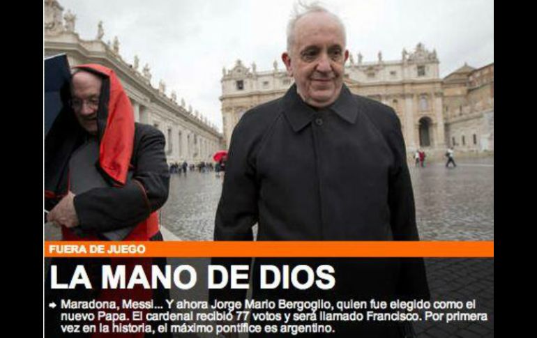 Internacional | Medios en internet se mantienen al tanto del nombramiento de Jorge Mario Bergoglio Sitios argentinos destacan elección del Papa Francisco Medios en internet se mantienen al tanto del nombramiento de Jorge Mario Bergoglio Por: EL INFORMADOR 13 de marzo de 2013 - 15:25 hs El sitio Olé.com tituló la nota del nuevo pontífice como La mano de Dios. ESPECIAL / GUADALAJARA, JALISCO (13/MAR/2013).- Medios virtuales en Argentina han difundido la noticia del papa argentino que hoy fue dado a conocer en la Basílica de San Pedro en el Vaticano. Los destacados citan a Jorge Mario Bergoglio como el primer latinoamericano en ocupar el cargo, tal es el caso del Calrin.com que en una foto de gran tamaño titula la noticia como "El Nuevo Papa es el argentino Jorge Bergoglio y se llama Francisco I" y presenta una crónica de la elección ocurrida por la tarde del 13 de marzo (horario de México). El portal Infonews.com escribe en su portada "Emoción en Vaticano" y destaca entre sus principales notas, la trayectoria, algunas reacciones en redes sociales e imágenes de banderas argentinas en la plaza de San Pedro, así como información que el religioso era "hincha" del club San Lorenzo de Almargo en donde se confiesa amante del fútbol, del boxeo y del tenis. Por su parte el sitio de noticias deportivas Ole.com.ar causó polémica en las redes sociales al activar en su portada una imagen del Papa Francisco con el titula "La mano de Dios" que da cuenta de la elección del argentino. En el cuerpo de la nota se puede leer "Maradona, Messi... Y ahora Jorge Mario Bergoglio, elegido como el nuevo Papa" comparándolo con estrellas del futbol. Y continúa " Sí, como para que la conocida frase 'Dios es argentino' sume algo más de valor. Temas Europa Ciudad del Vaticano Sucesión papal Papa Francisco Recibe las últimas noticias en tu e-mail Todo lo que necesitas saber para comenzar tu día Registrarse implica aceptar los Términos y Condiciones