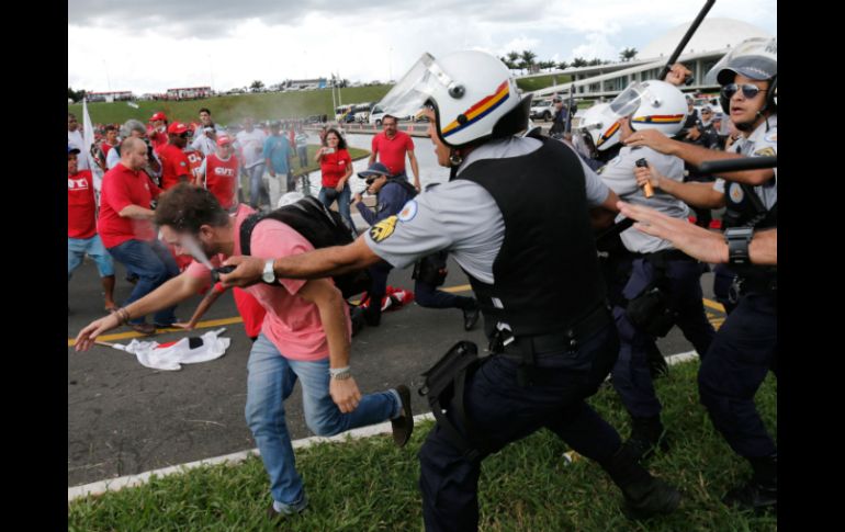 Internacional | Los agentes intentaron desalojarlos durante una manifestación contra una ley laboral Trabajadores y policías se enfrentan en protesta en Brasilia Los agentes intentaron desalojarlos durante una manifestación contra un proyecto de ley laboral para la subcontratación Por: NTX 7 de abril de 2015 - 21:17 hs BRASILIA (07/ABR/2015).- Trabajadores brasileños que protestaban ante la sede del Congreso en Brasilia se enfrentaron hoy con la policía, que intentaba desalojarlos, durante una concentración en contra de un proyecto de ley laboral para la subcontratación. Los agentes utilizaron gas pimienta y bastones para impedir que los sindicalistas ingresaran al edificio legislativo, por lo que al menos tres manifestantes fueron atendidos por el Departamento Médico de la Cámara, uno de ellos con heridas en la cabeza. "Queremos que la Policía Legislativa responda por lo ocurrido hoy en la Cámara de Diputados", reclamó el líder sindical electricista Jobert de Paula, del estado de Minas Gerais. Las protestas en Brasilia formaron parte de una jornada nacional en contra del proyecto, que reglamenta la subcontratación o "tercerización" de personal, y que según los sindicatos precarizará las condiciones laborales. El promotor del proyecto, el exdiputado Sandro Mabel, del conservador Partido del Movimiento Democrático Brasileño (PMDB), arguye que el proyecto regularizaría las condiciones actuales del personal tercerizado. Sin embargo, los sindicalistas sostuvieron que lejos de solucionar los problemas de los tercerizados, la iniciativa pretende ampliar la subcontratación a todo tipo de tareas, y no solamente servicios o actividades de apoyo, por lo que afectaría a más trabajadores. "La tercerización es un cáncer para la clase trabajadora, y no la queremos para otros gremios. Sabemos lo que es ser tercerizado", dijo un empleado de seguridad privada, quien señaló problemas como la alta rotatividad, bajos salarios, carencia de prestaciones y alto riesgo de accidentes. Otros oradores durante el mitin ante el Congreso resaltaron que la tercerización desarticula la organización de los trabajadores, y está diseñada para destruir al movimiento sindical y precarizar los derechos laborales. Temas América Latina Brasil Manifestaciones en el mundo Lee También Fallece Junior Dutra al realizarse cirugía estética en manos de dentista sin licencia José Jerí asume como presidente de Perú Congreso de Perú destituye como presidenta a Dina Boluarte Chivas viaja con ‘Chicharito’ y Robinho al amistoso ante América en Estados Unidos Recibe las últimas noticias en tu e-mail Todo lo que necesitas saber para comenzar tu día Registrarse implica aceptar los Términos y Condiciones