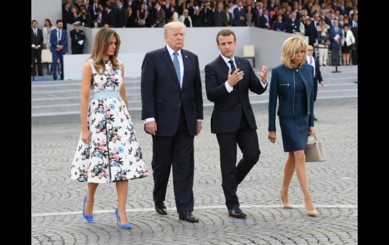 PARÍS, FRANCIA (14/JUL/2017).- El presidente de Estados Unidos, Donald Trump, encabezó aquí como invitado de honor el desfile militar del Día Nacional de Francia, en el que figuraron tropas de ese país para conmemorar el centenario de su participación en la Primera Guerra mundial.Durante dos horas, Trump estuvo sentado al lado de su anfitrión, el presidente francés Emmanuel Macron, quien lo invitó a presidir juntos la parada militar de la Avenida de los Campos Elíseos, con la que Francia celebra el 14 de julio, su día nacional."Estados Unidos son de esos aliados seguros, amigos, que vinieron a nuestra ayuda. Por ello nada no separará nunca", declaró Macron en un breve discurso al término del desfile, en el que se interpretó el himno de ese país y se desplegó su bandera.Cerca de dos centenares de militares de la Marina, el Ejército de Tierra y el Ejército del Aire de Estados Unidos abrieron el desfile. Ocho aviones sobrevolaron también la Avenida de los Campos Elíseos y la Plaza de la Concordia, en la que se instaló la tribuna de autoridades.En cabeza del destacamento militar americano desfiló un grupo vestido con el uniforme que portaban los soldados que en 1917 desembarcaron en Francia para ayudar al país europeo y a sus aliados en la Primera Gran Guerra (1914-1918).Al finalizar el desfile, Trump y Macron platicaron brevemente y mostraron gestos de complicidad y de buena relación, junto a las dos primeras damas de ambos países.Trump llegó la víspera a París para asistir al desfile, el motivo principal de su primera visita oficial a Francia.Concluyó su visita, exclusivamente a esta capital, al término de la parada militar, que estuvo vigilada por un operativo de miles de policías, gendarmes, militares, un dron y varios barcos por el río Sena.Durante su primera jornada fue recibido con honores por el presidente francés en el Museo de los Inválidos, donde visitó la tumba de Napoleón Bonaparte, y luego se entrevistó con Macron en su residencia del Palacio del Elíseo para después ofrecer una rueda de prensa conjunta.Por la noche cenó acompañado de su esposa con Macron y la primera dama francesa en un restaurante de lujo de la Torre Eiffel.Pese a su impopularidad, la mayoría de franceses ha aprobado la visita de Trump a Francia para asistir a la parada militar, con la que se conmemora el estallido de la Revolución Francesa, de acuerdo a dos sondeos.