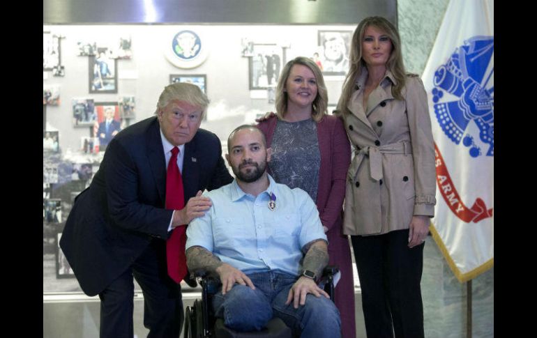WASHINGTON, ESTADOS UNIDOS (22/ABR/2017).- El presidente de Estados Unidos, Donald Trump, visitó hoy un hospital en Bethesda (Maryland) para otorgar una importante condecoración militar a un soldado que en marzo resultó herido en Afganistán y perdió parte de su pierna derecha.Acompañado por la primera dama, Melania Trump, el mandatario otorgó al sargento Álvaro Barrientos un corazón púrpura, un distintivo que sirve para reconocer a los militares que han resultado heridos o han muerto en actos de servicio."Cuando supe sobre esto, quería hacerlo yo mismo. Felicidades de parte de Melania, de mí y de la nación entera", dijo Trump, quien a continuación colocó su mano en el hombro de Barrientos, besó en la mejilla a su esposa, Tammy, y colocó la medalla en la solapa del soldado.La breve ceremonia acabó con Trump dando una palmada en la espalda al soldado y con un aplauso.Esta es la primera vez que Trump visita el hospital militar Walter Reed, situado solo a unos 15 kilómetros de la Casa Blanca y al que suelen acudir los presidentes, aunque la mayoría de las visitas no reciben cobertura de la prensa.Mientras estuvo en el hospital, Trump se reunió durante una hora y media con otros militares que están recibiendo tratamiento.Aunque Trump evitó ir a la Guerra de Vietnam por un diagnóstico de juanetes, durante la campaña electoral realizó diferentes actos en solidaridad con veteranos de guerra y recaudó dinero para financiar iniciativas de ayuda al empleo o la salud, las principales necesidades de los excombatientes.El millonario ganó en las urnas un gran apoyo entre este colectivo, al que se ha esforzado en complacer durante sus casi primeros 100 días del Gobierno.
