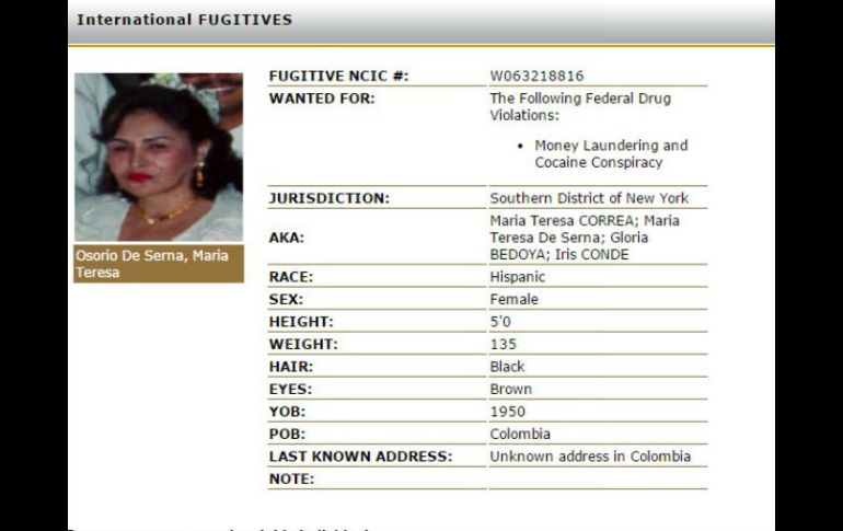 Internacional | La agencia estadounidense le considera la más grande 'lavadora' de dinero Una colombiana, la más buscada por la DEA tras captura del 'Chapo' La agencia estadounidense le considera la más grande 'lavadora' de dinero para los narcotraficantes Por: SUN 13 de enero de 2016 - 19:37 hs La información y datos fotográficos que se tiene de Osorio es limitada; algunos archivos le han dado el apodo de 'narco fantasma'. ESPECIAL / www.dea.gov CIUDAD DE MÉXICO (13/ENE/2016).- Una mujer de Colombia es ahora la narcotraficante más buscada por la agencia antidrogas de EU (DEA) tras la captura del mexicano Joaquín “El Chapo” Guzmán el pasado viernes. Se trata de María Teresa Osorio de la Serna, quien estuvo vinculada al extinto cártel de Medellín. Osorio de la Serna, también conocida con los alias de María Teresa Correa, Gloria Bedoya e Iris Conde, es señalada por la DEA por ser la más grande “lavadora” de dinero para los narcotraficantes colombianos, explica el diario español ABC. De 65 años de edad, la mujer ha pasado a ser el objetivo principal de la división internacional de la DEA, seguida de John Alexander Thompson, acusado traficar con heroína. Su nombre figura en la lista de los más buscados de la DEA desde 2010. Pese a que es considerada como una narcotraficante de “peso” en varios países, no cuenta con ningún requerimiento judicial para su captura en su país. De hecho, no hay información precisa en las bases de datos de la Fiscalía y de la Fuerza Pública. Aunque Estados Unidos no descarta que estén en Latinoamérica, informa el diario colombiano “El Tiempo”. En 1997, Osorio contaba con una orden judicial firmada por Andrew J. Peck, juez del Distrito de Nueva York, acusada de narcotráfico entre Colombia y Estados Unidos, informa ABC. La información y datos fotográficos que se tiene de Osorio es limitada, incluso en archivos de Interpol, por lo que algunos medios internacionales le han dado el apodo de “la narco fantasma”. Se cree que la mujer reside en Colombia, pero últimos archivos de las agencias internacionales que la buscan la ubican en EU, en New Jersey y ciudades como Miami y Hialeah en Florida. Temas América Latina Colombia Narcotraficantes Joaquín Chapo Guzmán DEA Lee También ¿Dónde ver EN VIVO el partido amistoso México vs Colombia? José Jerí asume como presidente de Perú Congreso de Perú destituye como presidenta a Dina Boluarte Naasón, Covarrubias, Omar… Recibe las últimas noticias en tu e-mail Todo lo que necesitas saber para comenzar tu día Registrarse implica aceptar los Términos y Condiciones