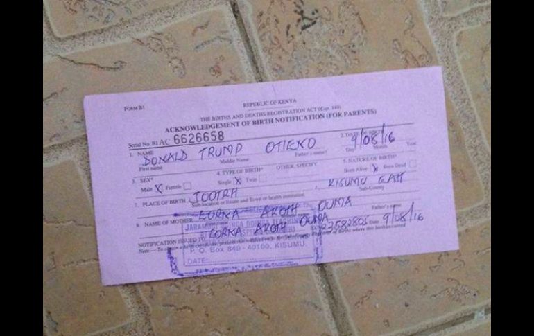 NAIROBI, KENIA (14/NOV/2016).- Una pareja keniana ha decidido llamar a su hijo "Donald Trump" en honor al nuevo presidente de Estados Unidos, de quien elogian "sus principios" y "franqueza", informaron hoy medios locales.El pequeño Donald Trump Otieno, de tres meses de edad, nació en Kisumu, región del oeste de Kenia de donde procede el padre de Barack Obama y donde el todavía presidente de EU es idolatrado y considerado un compatriota.Por ello, los progenitores han recibido una avalancha de críticas en su vecindario y en las redes sociales, algo que han ignorado al considerar que éstas proceden de simpatizantes de la demócrata Hillary Clinton, declararon al diario Daily Nation.El tercer hijo de Felix Otieno y la Lorna Akoth nació el pasado 9 de agosto. "En aquel momento, todavía no estaba seguro de si Trump lograría su sorprendente victoria, pero tenía la convicción de que el empresario tenía lo que hay que tener para ser un líder", declaró el padre del pequeño.A pesar de las críticas, los padres del Donald Trump keniano justificaron la decisión de bautizar a su vástago con el nombre del magnate en sus "reseñables principios" y su habilidad para "decir lo que piensa".El padre del bebé Trump elogió la capacidad del republicano para hacer "duras declaraciones" al margen de la opinión del público."No hay muchos políticos tan sinceros como él. Le admiro porque es un hombre que dice lo que piensa", explicó Otieno.La madre también se deshizo en elogios hacia el nuevo inquilino de la Casa Blanca: "Ha sido franco y se ha mostrado firme. Ha dicho la verdad sin usar propaganda o mentiras para ganar votos. Lo adoramos y por eso hemos llamado a nuestro hijo como a él".