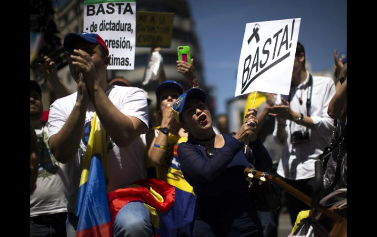 MADRID, ESPAÑA (10/JUN/2017).- Unos 400 venezolanos manifestaron este sábado en el centro de Madrid, para expresar su repudio al gobierno de Nicolás Maduro.Los manifestantes, algunos procedentes de otras ciudades españolas como Sevilla, Murcia o Alicante, se congregaron en la plaza de Callao con lemas como "Basta de dictadura, de represión, de víctimas" o "Fuera Maduro, elecciones ya", en alusión a su polémico proyecto de convocar una Asamblea Constituyente.Fueron convocados por 32 organizaciones y partidos opositores integrados en la coalición Mesa de la Unidad Democrática (MUD)."Queremos que la dictadura se vaya del país; que vuelva a haber libertad en Venezuela. Por eso estamos aquí, para aportar un granito de arena", dijo Lizet Morales, que vino desde Alicante (sureste) y lucía una pancarta con el retrato del encarcelado líder opositor Leopoldo López y el lema "Leopoldo Libertad Ya"."Nuestra motivación es volver a nuestro país. Allí tenemos nuestra familia y nuestro trabajo, que dejamos para venir aquí y empezar de cero", declaró por su lado Sergio Alaimo, un joven de 23 años empleado de telemarketing en España, que hace cinco meses emigró desde su natal Valencia porque "el dinero que ganaba no [le] daba para crecer".En el acto participó también Diego Scharifker, concejal del municipio caraqueño de Chacao, quien desde el estrado lanzó que "el pueblo venezolano siempre va a poder más que los intentos de un grupito por mantener el poder".Actualmente, el presidente Maduro está impulsando una Asamblea Constituyente que según la fecha fijada por el poder electoral se votará el 30 de julio, y servirá para reformar la Constitución.Sus detractores exigen su salida del poder y han organizado en el país numerosas marchas de protesta desde el 1 de abril, en las que ha habido 66 muertos y más de mil heridos.