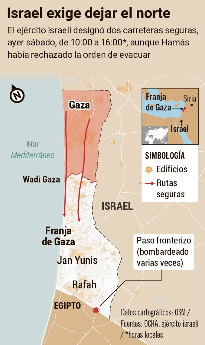 Irán envió un mensaje a Israel ayer subrayando que no quiere una mayor escalada en la guerra que involucra a Hamás, pero que tendrá que intervenir si la operación israelí en Gaza continúa, dijeron a Axios, agencia de información, dos fuentes diplomáticas con conocimiento de la situación.El ministro de Asuntos Exteriores iraní, Hossein Amir-Abdollahian, se reunió ayer en Beirut con el enviado de la ONU en Medio Oriente, Tor Wennesland, dijeron las dos fuentes diplomáticas.De acuerdo con Axios, Wennesland instó a Amir-Abdollahian a ayudar a prevenir una ampliación del conflicto en Gaza e Israel a la región más amplia de Medio Oriente.El Ministro de Asuntos Exteriores iraní respondió que Irán no quiere que el conflicto se convierta en una guerra regional y quiere intentar ayudar con la liberación de los civiles que están como rehenes de Hamás en Gaza, pero Amir-Abdollahian destacó que Irán tiene sus líneas rojas.Dijo que si la operación militar israelí continúa, y especialmente si Israel cumple su promesa de una ofensiva terrestre en Gaza, Irán tendrá que responder, según las fuentes.Wennesland llamó al asesor de seguridad nacional israelí, Tzachi Hanegbi, y a otros funcionarios y les transmitió el mensaje de Irán, dijeron las fuentes.La oficina de Wennesland confirmó que se reunió con Amir-Abdollahian ayer e informó que discutieron "esfuerzos diplomáticos para liberar a los rehenes, reducir la escalada y evitar que el conflicto se extienda a la región en general".La Oficina del Primer Ministro israelí declinó hacer comentarios. El Ministerio de Asuntos Exteriores de Irán no respondió de inmediato a una solicitud de comentarios.Axios recuerda que los combates entre Hamás e Israel se convertirán en una guerra regional si Irán se involucra directa o indirectamente, como a través de un grupo militante en Siria o respaldando cualquier decisión de Hezbolá de unirse plenamente a los combates.La ofensiva terrestre de Israel a Gaza se planeó "originalmente para el fin de semana, pero se retrasó unos días, al menos en parte debido a las condiciones de nubosidad que habrían dificultado que los pilotos y operadores de drones israelíes proporcionaran cobertura aérea a las fuerzas terrestres", indicó The New York Times, que reconstruyó el plan con base en tres altos oficiales militares israelíes que describieron detalles no clasificados.La invasión se hará "en los próximos días con decenas de miles de soldados con la orden de capturar la ciudad de Gaza y destruir el liderazgo actual del enclave, según tres altos oficiales militares israelíes que describieron detalles no clasificados sobre el plan".El ejército ha remarcado que el objetivo final "es acabar con la máxima jerarquía política y militar de Hamás, el grupo palestino que controla Gaza y encabezó los ataques terroristas de la semana pasada en Israel que mataron a mil 300 personas".Los palestinos batallaban ayer para huir de las zonas de Gaza que eran impactadas por las fuerzas militares israelíes, al tiempo que hacían frente a una creciente crisis de agua y una escasez de medicamentos, previo a una anticipada ofensiva terrestre una semana después del sangriento ataque de Hamás contra Israel.Israel renovó sus llamamientos en las redes sociales y en panfletos lanzados desde el aire para que los residentes de Gaza se trasladaran al sur, mientras Hamás instaba a la población a permanecer en sus hogares. La ONU y los grupos de ayuda han afirmado que un éxodo tan rápido causaría un sufrimiento humano incalculable.La directiva de evacuación abarca un área de 1.1 millones de habitantes, aproximadamente la mitad de la población del territorio. El ejército israelí dijo que "cientos de miles" de palestinos ya habían hecho caso a la advertencia y se habían dirigido al sur. Dio a los palestinos un plazo de seis horas que finalizó ayer por la tarde para viajar con seguridad dentro de Gaza por dos rutas principales.Una semana después del ataque de Hamás, Israel seguía trabajando para determinar las víctimas. Con la aprobación especial de los rabinos, los trabajadores de una base militar en el centro de Israel continuaron la agotadora tarea de identificar los cadáveres de los israelíes y extranjeros muertos, en su mayoría civiles.Grupos armados presentes en la provincia meridional siria de Deraa lanzaron ayer al menos un cohete contra Israel, que respondió con artillería y morteros, en el segundo incidente de este tipo ocurrido en los últimos tres días, informaron fuentes de ambos lados de la frontera.El Ejército israelí informó que dos proyectiles "lanzados desde Siria" cayeron en un área despoblada del territorio israelí y expresó que poco después sus fuerzas dispararon artillería y morteros contra las zonas donde se originó el ataque.Por su parte, el Observatorio Sirio de Derechos Humanos explicó en un comunicado que el lanzamiento se produjo desde el área de Ain Dakar, en Deraa, y atribuyó su autoría a "facciones que trabajan con Hezbolá", grupo chiílibanés también presente en el territorio sirio.Según la ONG, con sede en el Reino Unido y una amplia red de colaboradores sobre el terreno, un único proyectil salió desde el país árabe y el Estado judío lanzó bengalas para poder descartar una infiltración a su territorio antes de responder contra el punto de procedencia de la acción.El pasado martes se registró un primer suceso con un lanzamiento similar desde la provincia meridional siria de Quneitra, adyacente a Deraa, mientras que el jueves la aviación israelí atacó con misiles los aeropuertos internacionales de Damasco y Alepo, en el noroeste de Siria.Siria acusó ayer a Israel de lanzar un ataque contra el Aeropuerto Internacional de Alepo (noroeste) por segunda vez en los últimos dos días, poco después de que grupos armados favorables al Gobierno sirio lanzaran al menos un proyectil contra el territorio israelí.La televisi