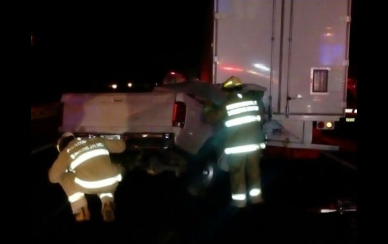 GUADALAJARA, JALISCO (23/OCT/2016).- La madrugada de este domingo, tuvo lugar un accidente en el kilómetro 15 de la carretera Guadalajara-Chapala, que dejó como resultado un hombre y una mujer prensados, los cuales fueron liberados por personal de Unidad Estatal de Protección Civil y Bomberos de Jalisco (UEPCBJ), sin embargo, ya se encontraban sin vida. Elementos de la corporación señalan que una camioneta tipo pick up modelo 1998, se impactó en la parte trasera de un tráiler, por lo que el conductor, identificado como Héctor David García Zárate de 45 años, murió instantáneamente, junto con su acompañante, una mujer mayor de edad que no ha sido identificada. Para determinar la identidad de la mujer, la UEPCBJ continúa trabajando con personal de Bomberos de El Salto, Tlaquepaque, Instituto Jalisciense de Ciencias Forenses y el Ministerio Público.