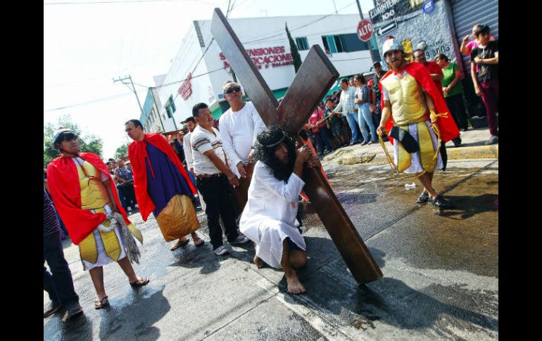 GUADALAJARA, JALISCO (14/ABR/2017).- "Muévanse mujeres", "Como no puedes sólo, te tienen que ayudar", "Ándale, apúrate", le gritan los soldados romanos al hombre que representa a Jesucristo en el Viacrucis del barrio de Analco. Antonia Hernández Jasso es una de las féminas que ayuda al hijo de Dios a levantar la Cruz; ya lleva cuatro estaciones."Es hermoso acompañar a Jesús en su calvario, de que lo crucificaron, así como nuestro señor falleció por nosotros, nosotros nos sacrificamos por él también", dice Antonia, cuyos ojos se ponen llorosos de emoción al explicar sus sentimientos. La mujer cuenta que vive en Chicago pero regresa en estas fechas a Guadalajara para visitar a su hija, quien habita en el barrio, en la calle Nicolás Bravo."Cada año vengo a participar, me deja muchas enseñanzas, depende de la fe que las personas tengan, todas las estaciones dejan algo, a mi suegra le gustaba mucho aunque Diosito ya la recogió pero ella también participaba, son las tradiciones que uno puede seguir haciendo según la fe de la persona, para mí es bien hermoso", dice mientras alienta a unas niñas a que ahora ellas ayuden a Jesús poco antes de la estación XII, cuando este muere en la Cruz.Las mujeres, los jóvenes, los niños, las personas de la tercera edad o los enfermos son convocados para que apoyen al hombre que va descalzo, sudoroso bajo el Sol. José de Jesús Velázquez, vecino de Analco, encabeza a los ayudantes en la última estación, cuando el hijo de Dios es sepultado."Cada año compartimos el dolor de nuestro señor Jesucristo, nos pidieron que cargáramos la cruz por enfermedad, tengo una enfermedad de mis bronquios, mis pulmones y con todo mi amor tratando de sentir un poco lo que sintió nuestro señor en este tiempo", explica.José de Jesús dice que la parte de las tres caídas es donde se siente más triste e identificado con el dolor de Cristo. "Para mí es un momento muy especial la Semana Santa, el Viacrucis, me voy feliz, es como una reivindicación, sentirme bien, volver a encontrar la brújula de la vida de uno, uno a veces se queja de cosas y Jesucristo nos demuestra cada año que él está allí para nosotros"Velázquez señala que su participación, aunque pequeña, lo llena de alegría. "Es una cosa muy hermosa, lo máximo como católico que soy, ver este mundo que está un poco mal. Que a pesar de cómo está la situación en nuestro país haya tanta gente que se acerca todavía, ver niños y jóvenes".El Viacrucis comenzó minutos después de las 10:00 horas en el templo de San José de Analco y se realizó por calles como Constitución, José Luis Verdía, Antonio Bravo Sánchez, Bartolomé de las Casas, 28 de enero, Guadalupe Victoria y Cuauhtémoc, hasta llegar a la parroquia de San Sebastián. En el recorrido, de aproximadamente dos horas, participaron niños, jóvenes y adultos; algunos se movieron en sillas de ruedas o bicicletas.Una década de representar a JesúsVíctor Vaca Flores fue uno de los hombres que representó a Jesucristo en las estaciones, específicamente en la número X. "Cuando es despojado de sus vestiduras, es una representación que yo creo que es buena, sobre todo como creyente, como católico es hacer vivo el evangelio", indica.Vaca Flores, quien es de El Santuario, subraya que lleva participando en Viacrucis desde hace diez años y que cada vez trata de mejorar, ya sea en el vestuario o en detalles como ejercitarse adecuadamente. "Como creyente digo que nadie somos dignos de representar a Jesús pero me deja buena satisfacción, te emocionas, a veces derramas lágrimas. Esta vez como no iba a ser cargar la cruz no me preocupé tanto por el ejercicio, eso por un lado pero por otro lado siempre cuido la doctrina, la fe, formarme en ese sentido, leer el evangelio".El joven resalta que es la primera vez que participa en Analco, pero que ha estado en otras parroquias, obras de teatro e incluso en el Santuario de los Mártires. "Tenía mucho interés en hacer la imagen plástica, la representación de una estación, eso no lo había hecho, así como las imágenes que tiene cada Viacrucis, me pareció novedoso".EL DATOEsta noche en Analco se llevará a cabo la Primera Gran Procesión del Silencio y la Vía Dolorosa. Más información en https://www.semanasantaenguadalajara.com/EL INFORMADOR/ILSE MARTÍNEZ