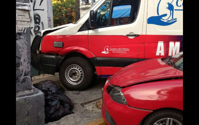 GUADALAJARA, JALSICO (14/JUN/2017).- Una ambulancia particular protagonizó un percance vial esta mañana en la Zona Centro de Guadalajara.El vehículo impactó contra la fachada de una escuela, ubicada en la esquina de la avenida Hidalgo y la calle Juan N. Cumplido, en la Zona Centro de Guadalajara.A su paso, la ambulancia chocó contra un auto compacto rojo ocasionando que se complicara la vialidad en la zona pues el incidente obstruía en carril de extrema derecha.