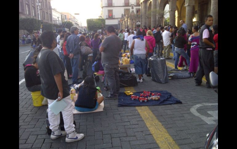Jalisco | Según versiones, es la respuesta al operativo municipal para desalojarlos de la zona Ambulantes vuelven a bloquear Hidalgo y 16 de Septiembre Según versiones, es la respuesta al operativo municipal para desalojarlos de la zona Por: EL INFORMADOR 21 de diciembre de 2012 - 16:42 hs Agregaron una complicación al caos en el Centro tapatío al bloquear el cruce de las avenidas Hidalgo y 16 de Septiembre. / GUADALAJARA, JALISCO (21/DIC/2012).- Minutos antes de las 5 de la tarde, en plena efervescencia de las compras decembrinas, comerciantes ambulantes agregaron una complicación al caos en el Centro tapatío al bloquear el cruce de las avenidas Hidalgo y 16 de Septiembre. Aunque no es un grupo numeroso, quienes cierran la vialidad se organizan para tender sus productos sobre el arroyo vehicular y afuera del Ayuntamiento de Guadalajara y así poner al punto de colapso el primer cuadro. Según versiones, esta sería la respuesta inmediata del gremio de ambulantes al operativo realizado este mismo día por autoridades municipales para desalojarlos de la zona. PARA SABER La última vez que los comerciantes ambulantes se manifestaron de esta manera en la zona, fue el pasado lunes 19 de noviembre. EL INFORMADOR / SERGIO RODRÍGUEZ Temas Ayuntamiento de Guadalajara Municipios Comercio ambulante Calles y vialidades de Guadalajara Lee También Portal 101 convertirá a los muebles en protagonistas de un circo escénico Aeropuerto Internacional de Guadalajara estrena servicio de shuttle Ticketmaster tiene todos estos conciertos al 2x1 en Ciudad de México ¿FRÍO en GDL por la noche?, pronóstico del clima para hoy, 16 de octubre Recibe las últimas noticias en tu e-mail Todo lo que necesitas saber para comenzar tu día Registrarse implica aceptar los Términos y Condiciones