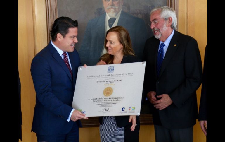 GUADALAJARA, JALISCO (19/OCT/2016).- Debido a la operación del edificio del Instituto de Información Estadística y Geográfica de Jalisco (IIEG), el gobernador de Jalisco, Aristóteles Sandoval, recibió el máximo Distintivo Ambiental Oro de manos del rector de la UNAM, el Dr. Enrique Luis Graue Wiechers.El distintivo se otorga debido al nivel de desempeño más alto en cuatro ejes: eficiencia energética, uso eficiente y racional del agua, manejo de residuos sólidos y consumo responsable.Por su parte, Aristóteles destacó que este reconocimiento plantea un reto para Jalisco, para impulsar políticas públicas y una mayor participación social en temas ambientales, como un gobierno subnacional y promotor de prácticas dirigidas a frenar el cambio climático.El Distintivo está homologado con los estándares internacionales de evaluación del desempeño Sustainability Tracking, Assessment & Rating System (STARS) y Leadership in Energy and Environmental Design (LEED), así como con criterios internos en adquisición de bienes de la UNAM. Se realiza la evaluación cada año con brigadas de EcoPuma, las cuales recaban información in situ.SABER MÁSEl edificio del IIEG, ubicado en Ciudad Granja, fue concebido como un espacio moderno, incluyente y amigable con el medio ambiente, opera con celdas fotovoltaicas, lámparas LED, planta de tratamiento, filtros de agua para beber, espacios libres de humo y de unicel, con ciclopuertos, entre otras características.