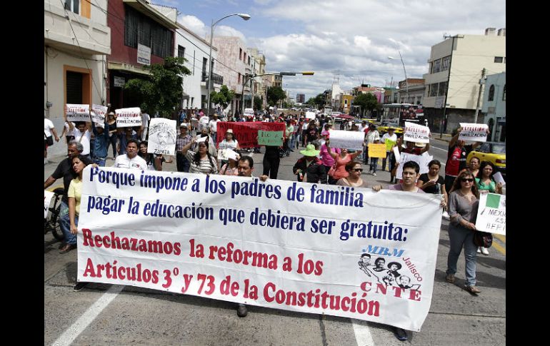 Jalisco | Vocero señala que marcharán contra la reforma educativa el 21 de septiembre Asamblea Magisterial de Jalisco seguirá resistencia pacífica Vocero del movimiento señala que marcharán contra la reforma educativa el 21 de septiembre Por: EL INFORMADOR 16 de septiembre de 2013 - 15:13 hs Maestros no se unirán a convocatoria de paro del CNTE pero dicen abonarán a la causa con megamarcha del sábado. ARCHIVO / GUADALAJARA, JALISCO (16/SEP/2013).- Si no se unirán al paro nacional el próximo jueves y viernes es porque la convocatoria de la Coordinadora Nacional de Trabajadores de la Educación (CNTE) llegó después de finalizar la reunión del sábado en donde la Asamblea Magisterial Democrática, de Jalisco, definió como siguiente acción de "resistencia" contra la reforma educativa una marcha el 21 de septiembre, aclaró Juan Carlos Banderas, vocero del movimiento. "El paro, las 48 horas que está convocando la Coordinadora -jueves y viernes--, nosotros vamos a abonar con la megamarcha del sábado. Nosotros no vamos a dejar de trabajar en la resistencia pacífica. No hay ningún acuerdo con el Gobierno en que diga 'ya platicaron conmigo, ya no van a hacer acciones'. Al contrario, las acciones van a ir subiendo de tono". Banderas declaró lo anterior al cuestionarle por los dichos del secretario general de Gobierno, Arturo Zamora, quien descartó paros y plantones en la Entidad, luego del diálogo que sostuvieran miembros de la Asamblea con el gobernador Aristóteles Sandoval el 14 de septiembre, aunque el maestro no especificó a qué se refería con "subir de tono" en las acciones. El miembro del Movimiento de Bases Magisteriales recordó que la "demanda central" para el mandatario estatal, como cabeza del Ejecutivo, es que impulse una controversia para la abrogación de los artículos constitucionales 3 y 73. Apuntó que la respuesta a la solicitud sería dada el próximo sábado. Juan Carlos citó que el gobernador les dijo que "la educación pública en Jalisco no se va a privatizar. El que lo haya dicho desde luego que para nosotros es un avance, pero falta concretar la cuestión legal", para que se sustente. El miércoles pasado, según cifras de la Secretaría de Educación Jalisco, en 203 escuelas no se laboró, luego de que la Asamblea Magisterial Democrática convocara a los docentes de la Entidad a unirse al paro nacional. Éste consistió en Jalisco en suspender la labor docente con los alumnos, para reunirse con padres de familia e informarles los alcances de la reforma educativa e incluso también de la energética. Acopiarán víveres para la CNTE De cara a la "recuperación" del Zócalo capitalino esta semana, por parte de miembros de la CNTE, Juan Carlos Banderas dijo que pusieron en marcha una campaña para reunir víveres para ellos. Explicó que en cada región hay un coordinador de la asamblea para recibir las provisiones y que el sábado que marchen de La Normal al Centro Histórico tapatío, habrá mesas en el primer punto para juntar las que se recolecten en el Estado y así enviarlas ese día a la Ciudad de México. Invitó a llevar alimentos no perecederos a los maestros, padres de familia y personas que quieran respaldar "la defensa de la escuela pública y los derechos de los trabajadores". Ayer domingo, jóvenes que no quisieron revelar su identidad acopiaron víveres en el Parque Revolución también para integrantes de la Coordinadora. EL INFORMADOR / MIRIAM PADILLA Temas Educación Reforma Educativa CNTE Recibe las últimas noticias en tu e-mail Todo lo que necesitas saber para comenzar tu día Registrarse implica aceptar los Términos y Condiciones