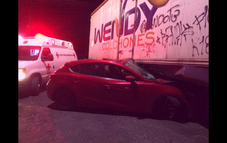 GUADALAJARA, JALISCO (04/ABR/2017).- Al filo de la madrugada de este martes se registró un choque en la colonia Industrial.La Unidad de Protección Civil y Bomberos de Guadalajara informó del percance donde un atomóvil rojo de modelo reciente terminó impactado contra un camión de carga pesada.A pesar de que parte del vehículo quedó debajo del camión, ninguno de los tres hombres que se encontraban a bordo del vehículo resultó lesionado de gravedad.Los hechos ocurrieron al cruce de la avenida 8 de julio y la Calle 3, en la colonia Industrial de Guadalajara.
