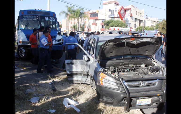 Jalisco | El chofer del autobús indicó que la unidad se quedó sin frenos Camión de la ruta 25 provoca la muerte de un hombre El chofer del autobús indicó que la unidad se quedó sin frenos, por lo que trató de maniobrar Por: EL INFORMADOR 26 de octubre de 2010 - 05:06 hs En el percance participaron dos camionetas, un par de autos compactos y la unidad del transporte público. A. HINOJOSA / ZAPOPAN, JALISCO (26/OCT/2010).- Un camión del transporte público provocó una “chuza” contra cuatro vehículos, después de que presuntamente se quedó sin frenos, resultando una persona muerta y nueve lesionados. Los hechos se registraron sobre la Avenida Patria a su cruce con la calle León Tolstoy, de la colonia Jardines Universidad, en el municipio de Zapopan, cuando el camión de la 25, conducido por Alberto Lozano Amador, que circulaba de la Avenida Vallarta hacia Pablo Neruda, se quedó sin frenos, lo que originó que el chofer realizara algunas maniobras, impactándose primeramente contra un árbol, brincara el camellón y después fuera a impactar a otros cuatro vehículos que circulaban en el sentido opuesto. Entre los automotores dañados se encuentra una camioneta tipo Honda Odisey, de modelo reciente, la cual era conducida por Nicole Deniss Ramal, de 33 años de edad, quien iba acompañada de una joven de 22 años y dos menores de 10 y siete años de edad, respectivamente. También participó otra camioneta tipo Honda CRV, en la que viajaba María Pérez Vivanco, de 55 años. Otro de los vehículos siniestrados es un Volkswagen Golf, en el que iba Hilda García, quien resultó ilesa. En un automóvil de la marca Toyota Corolla viajaba la víctima mortal que fue identificada con el nombre de Guillermo Asencio Espinosa, quien iba acompañado por dos menores de nueve y 10 años de edad. Tras el percance, los nueve lesionados fueron trasladados por paramédicos de la Cruz Roja y Verde a diferentes puestos de socoros y hospitales particulares. Hasta el sitio también arribaron elementos de Protección Civil y Bomberos de Zapopan. En la zona se originó un gran congestionamiento vial por más de tres horas. Temas Seguridad Accidentes con muertes en Jalisco Muertes a causa del transporte público Protección Civil Zapopan Lee También Celebran la participación de 3 millones de personas en la Romería 2025 En misa de bienvenida de "La Generala", cardenal pide por una reforma judicial justa Sheinbaum visitará los cinco estados afectados por lluvias Regresa a Zapopan "La Generala" como parte de la celebración de la Romería 2025 Recibe las últimas noticias en tu e-mail Todo lo que necesitas saber para comenzar tu día Registrarse implica aceptar los Términos y Condiciones