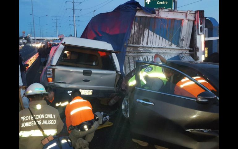 GUADALAJARA, JALISCO (22/SEP/2016).- Un vehículo de carga pesada volcó esta mañana en la autopista Zapotlanejo y avenida Patria, en la colonia Camichines, y ha causado varios lesionados y congestionamiento vial en uno de los ingresos a Guadalajara.Según reportes de Protección Civil, en el accidente estuvieron involucrados un tráiler que transportaba fruta, un camión de redilas y cinco automóviles más.Hasta el momento, se reportó que cuatro personas presentan lesiones, tres al parecer están prensados.Los carriles centrales de la vía mencionada, de oriente a poniente, permanecen cerrados mientras rescatistas trabajan para liberar a los lesionados.El accidente genera intensa carga vehicular en la zona de la Central Camionera, en la salida Oriente de la Zona Metropolitana de Guadalajara.Alrededor de las 08:30 horas comenzaron a mover los bloques de concreto de la barrera de contención para habilitar un carril de contraflujo y desbloquear las filas kilométricas de automóviles.Elementos de bomberos anticipan que la circulación de automóviles en el punto será complicada durante algunas horas, por lo que se pide evitar la ruta de ser posible.