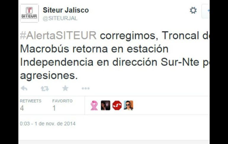 Jalisco | Movilidad informa que algunas rutas fueron agredidas durante la noche Camioneros sufren 'huevazos' por Halloween Movilidad informa que algunas rutas fueron agredidas durante la noche Por: EL INFORMADOR 31 de octubre de 2014 - 21:16 hs Por medio de su cuenta de Twitter, SITEUR reportó también algunas agresiones. TWITTER / @SITEURJAL GUADALAJARA, JALISCO (31/OCT/2014).- Personal de Comunicación de la Secretaría de Movilidad confirmó que unidades del transporte público han sido atacadas a huevazos. Al menos a cuatro camiones de la ruta 622 les han lanzado blanquillos durante la tarde a lo largo de su derrotero. Por medio de su cuenta de Twitter, Siteur reportó también algunas agresiones: "Troncal de Macrobús retorna en estación Independencia en dirección Nte-Sur por agresiones", señaló en su red social. Posteriormente, Siteur avisó que el servicio está suspendido en las estaciones Zoológico y Mirador de Macrobús debido a agresiones a las unidades. Además, las rutas alimentadoras 8, 18 y 19 presentan retraso en servicio por agresiones en Zonas Santa Cruz del Valle y Toluquilla. Cada 31 de octubre, camioneros de la Zona Metropolitana se quejan de que jóvenes "celebran" esta tradición norteamericana lanzando huevos a los autobuses del transporte público. Temas Transporte Público Vialidad Agresiones Siteur Halloween Lee También Estos son todos los cambios que tendrá el transporte público por el paso de la Romería Tren Ligero extenderá su horario de servicio este jueves Aseguran más huachicol en el municipio de Degollado Continúa la entrega de tarjetas Yo Jalisco Apoyo para el Transporte este 9 de octubre Recibe las últimas noticias en tu e-mail Todo lo que necesitas saber para comenzar tu día Registrarse implica aceptar los Términos y Condiciones