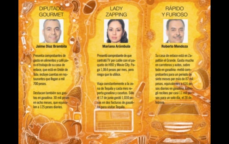 Jalisco | Manteniniento de autos, gasolina y alimentos; entre los gastos declarados por diputados Cargan Mini y Mustang a casa de enlace Mantenimiento de autos de lujo, alimentos, gasolina y paquetes de televisión e internet; entre los gastos de diputados locales Por: EL INFORMADOR 13 de diciembre de 2013 - 03:01 hs 20 de los 39 diputados del Congreso de Jalisco no comprobaron en el año en qué gastaron el apoyo recibido para casas de enlace. / GUADALAJARA, JALISCO (13/DIC/2013).- Los diputados jaliscienses utilizan los 92 mil pesos mensuales que reciben para casas de enlace en gastos que pueden ir desde casetas y gasolina, hasta ayudas sociales y apoyo para fiestas de vecinos. Como el panista Gildardo Guerrero, que reporta que paga el mantenimiento de cuatro autos que tiene en comodato: un Mustang Convertible Ford 1999, un BMW Mini Cooper Chili Man 2006, un Neón Chrysler 2000 y un Volkswagen Pointer 2009. El dinero de casas de enlace es una de las bolsas que los diputados conservaron luego de que hicieron un pacto de austeridad: además de su sueldo, que ronda los 70 mil pesos libres al mes, cobran los 92 mil de casas de enlace, 105 mil para contratar personal y hasta cinco mil pesos más los que presiden alguna comisión. De acuerdo con información del Congreso, 20 de los 39 diputados ni siquiera se molestaron en comprobar a tiempo esos gastos; ayer afirmaron que sí lo hicieron, pero sólo algunos mostraron documentos que pretendían que sirvieran como evidencia. Dos diputados no han recibido el dinero, y los 17 restantes presentaron documentación, pero ninguno justifica los 92 mil pesos por mes. Por eso destaca que, cuando presentan documentos, incluyen gastos como los de viáticos y gasolina, que habían quedado eliminados del presupuesto desde 2013. En cualquier caso, el Reglamento que ellos mismos diseñaron no les restringe ningún tipo de documentación. Así, por ejemplo, el priista Roberto Mendoza reporta un gasto en gasolina de 87 mil pesos en siete meses, pero omite dar a conocer contratos de comodato en los que exponga qué vehículos tiene. Los legisladores que hablaron del tema señalaron que los montos por gasolina se incrementaron porque en los primeros cuatro meses del año no recibieron dinero. No obstante, los documentos de Mendoza se refieren a los meses de enero a septiembre.Otro caso es el de la panista Mariana Arámbula, quien contrató un paquete de telefonía e internet, más televisión por cable, según un recibo que entregó el 8 de mayo. Pese a que incluye canales especiales, ella afirmó que su casa de enlace no tiene cable. También paga con ese dinero libros como la Agenda de Paulo Coelho y la edición de bolsillo de “Padres buenos, padres malos”. El secretario general del Congreso, Marco Antonio Daza Mercado, afirmó que suspendió la entrega de estos recursos a aquellos diputados que no los justificaron puntualmente hasta octubre. Cuando se le consultó en torno a cuáles son los legisladores que no han cumplido, respondió que tenía mucha prisa para informarlo. En qué se gastan los 92 mil pesos al mesDIPUTADO GOURMETJaime Díaz Brambila Presenta comprobantes de gasto en alimentos y café para el trabajo de su casa de enlace, que está en Unión de Tula; incluye cuentas en restaurantes que llegan a mil 700 pesos. Destacan también sus gastos en gasolina: 30 mil pesos en ocho meses, que equivalen a 125 pesos diarios. LADY ZAPPINGMariana Arámbula Presentó comprobante de que contrató TV por cable con el paquete de HBO y Movie City. Paga 1,064 pesos por mes, pero niega que lo utilice. Viaja constantemente a la zona de Tequila y cada mes reporta gasolina y casetas. Sólo el 17 de junio gastó 1,030 pesos en dos facturas de gasolina para visitar Tequila. RÁPIDO Y FURIOSORoberto Mendoza Su casa de enlace está en Zapotlán el Grande. Gasta mucho en carreteras y autos, sobre todo en gasolina: metió comprobantes para un periodo de siete meses por más de 87 mil pesos, equivalentes a 416 pesos diarios en gasolina. Entregó recibos por casi 11 mil pesos para un solo día, el 28 de febrero. Temas Congreso local PAN Jalisco PRI Jalisco PRD Jalisco Lee También Morena Jalisco respalda Reforma Judicial Comienza en Jalisco la Campaña Nacional de Vacunación de invierno Charros de Jalisco buscará frenar su racha negativa en juegos inaugurales de la LMP Gaby Cárdenas destaca avances en materia de cuidados en su primer año legislativo Recibe las últimas noticias en tu e-mail Todo lo que necesitas saber para comenzar tu día Registrarse implica aceptar los Términos y Condiciones