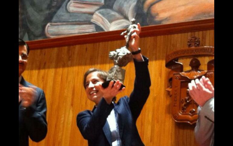 Jalisco | El premio le es otorgado por mantener una lucha en defensa de la libertad de expresión Carmen Aristegui recibe el galardón 'Corazón de León' El premio le es otorgado por mantener una lucha constante en defensa de la libertad de expresión Por: EL INFORMADOR 16 de mayo de 2014 - 14:00 hs La periodista recibe el galardón que la FEU entrega a personalidades por su trabajo en favor de la sociedad. Foto: @Canal44TV ESPECIAL / GUADALAJARA, JALISCO (16/MAY/2014).- Por su trayectoria periodística, su lucha constante en defensa de la libertad de expresión y la publicación de información en contra de grupos de poder, la periodista Carmen Aristegui recibió el galardón Corazón de León. El premio es otorgado por la Federación de Estudiantes Universitarios ( FEU) a ciudadanos distinguidos, cuya labor trasciende de manera importante en la sociedad. Después de recibir el galardón de manos de autoridades universitarias y estudiantiles la periodista Carmen Aristegui dirigió un mensaje a los jóvenes universitarios en el que destacó que el gran reto del país es defender la libertad de expresión ante el regreso a un sistema autoritario. La galardonada expresó que el país vive momentos de cambios importantes porque se han reformado numerosas leyes que modificarán las reglas del juego en materia educativa, económica, energética y electoral de la nación. Ante los cambios precisó que es necesario contar con información clara sobre la trascendencia de estas reformas y su efecto en la sociedad. Agregó que la sociedad mexicana vive un déficit democrático porque no se toma en cuenta al ciudadano para que opine o participe en foros de discusión sobre las reformas aprobadas entre las cúpulas partidistas en el Congreso de la Unión. Al finalizar el evento la periodista fue cuestionada sobre la influencia que tiene Raúl Padilla y su familia en la Universidad de Guadalajara. La comunicadora mencionó que es parte de una realidad contradictoria y que la influencia de la familia Padilla en la UdeG existe, pero también es cierto que la dinastía Padilla ha impulsado proyectos de trascendencia internacional como la Feria Internacional del Libro. El evento estuvo presidido por Tonatiuh Bravo Padilla, rector de la Universidad de Guadalajara, Ramiro Hernández Alcalde de Guadalajara y José Alberto Galarza Villaseñor, presidente de la Federación de Estudiantes Universitarios. La primera edición del galardón Corazón de León fue para Raúl Vera López por su trabajo en derechos humanos, en 2011 lo recibió el poeta y activista Javier Sicilia por su lucha para frenar la violencia en el país. Un año después el galardón fue para José Narro Robles, rector de la UNAM, por su defensa en la educación pública y promoción de la investigación científica. En 2013 al sacerdote Alejandro Solalinde por la defensa de los migrantes que van a Estados Unidos EL INFORMADOR / ANDRÉS ZÚÑIGA Temas Educación Periodismo FEU Carmen Aristegui Lee También Suspenden clases en estos 9 municipios de Jalisco ante el paso de tormenta tropical 'Raymond' Sociales: André e Isabella reciben la Primera Comunión en familia Sociales: El Informador inicia una nueva etapa con la moderna imprenta "Doña Stella" Lo que el caso Omar Bravo nos obliga a mirar Recibe las últimas noticias en tu e-mail Todo lo que necesitas saber para comenzar tu día Registrarse implica aceptar los Términos y Condiciones