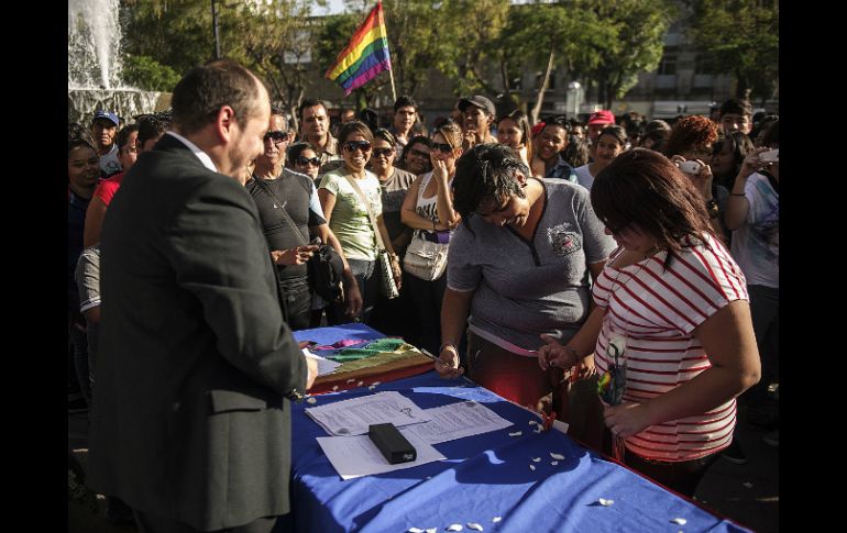 Jalisco | Se unen simbólicamente a menos de una semana del Día de San Valentín ''Casan'' a parejas del mismo sexo en Guadalajara Se unen simbólicamente a menos de una semana del Día de San Valentín en la Plaza Liberación Por: EL INFORMADOR 10 de febrero de 2013 - 18:14 hs GUADALAJARA, JALISCO (10/FEB/2013).- "¡Beso, beso!", pidió la multitud. Dania y Miriam juntaron sus labios para complacencia de los presentes. La tarde del domingo, parejas de hombres, mujeres, y hombre y mujer, celebraron bodas simbólicas en Plaza Liberación, para visibilizar la diversidad sexual, a menos de una semana del Día de San Valentín. Después de la boda, Dania Lomelí, miembro de Lesbow Land y pareja de Miriam Flores, declaró: "Me gustaría que en un futuro se legalizaran los matrimonios entre igualitarios porque yo ya vivo con alguien (seis meses) y es lo que más me gustaría; poder disfrutar de todas las ventajas por ley, infonavit, seguro, que no tenemos". Frente a un joven que hizo las veces de juez de registro civil, los novios y novias fueron pasando a juramentar su amor. Firmaron un acta y luego se tomaron fotos; algunos hasta anillos llevaron y unas mujeres brindaron con copas tras su unión. Hasta las 19:00 horas se habían registrado para participar unas 80 parejas. Pocas fueron las que llevaron atuendos formales y no se evidenció que alguna fuera acompañada por sus padres. En el Congreso del Estado han ido y venido iniciativas para regular la unión legal entre personas del mismo sexo, pero no han prosperado. Junto a la fuente de la plaza cercana al recinto que alberga el Poder Legislativo fue que se dieron los casamientos. Otra pareja de mujeres que se unió simbólicamente fue la conformada por Gabriela Orozco y Yitzel Alduñez, de 25 y 23 años, respectivamente. Ellas llevan dos meses juntas y planean casarse formalmente en noviembre, pero en el Distrito Federal, donde en marzo de 2010 entraron en vigor reformas al Código Civil que permiten matrimonios entre personas del mismo sexo; algo único en el país. Ellas se conocieron en la universidad, en la carrera de Química. "A mí me late (el evento en Plaza Liberación), porque es abrir la mente a todas esas personas que nos ven como un estereotipo", dijo Gabriela. Yitzel añadió: "Nosotras estamos juntas por el amor que nos tenemos y esperamos que nuestras familias nos apoyen". A ambas les entusiasmó ver que Zen y Alejandra celebraron la boda simbólica con un bebé en brazos; les gustaría tener hijos. En cambio, a Wenceslao Moya, de 22 años, y Enrique Maldonado, de 21, también les gustaría casarse legalmente, pero ellos quieren esperar a que en Jalisco se permita, para hacerlo; suman siete meses de novios. La convocatoria de la boda colectiva fue difundida por redes sociales y organizaron el evento grupos como Lesbow Land, Lesbian World Guadalajara, Coleta, Lesbianas de Jalisco, entre otros. Además, Lesbow Land creó un video que colgó a YouTube para invitar a las parejas a casarse en la Plaza Liberación. Este colectivo, por ejemplo, también publicó el 25 de enero en su página de Facebook: "Estamos cerca de San Valentín, como comunidad LGBT (Lésbico, Gay, Bisexual y Transexual) lo celebraremos con bodas simbólicas como un acto de concientización sobre la importancia de que se legalice el matrimonio entre personas del mismo sexo. VEN, UNETE Y SE PARTE!!". En países como Holanda, Bélgica, España, Canadá y Argentina tienen vigencia los matrimonios entre personas del mismo sexo; en Francia, a principios de mes, la Asamblea Nacional aprobó el primero de los artículos del proyecto de ley para legalizar el matrimonio homosexual en Francia. EL INFORMADOR / MIRIAM PADILLA Temas Guadalajara Municipios Plaza Liberación Matrimonio homosexual Lee También Con "Raymond" cerca, Guadalajara espera lluvias a esta hora del viernes "Raymond" AMAGA a Jalisco; lo que necesitas saber Fiestas de Octubre 2025: cartelera por fecha en el Auditorio Benito Juárez Clima en Guadalajara hoy: el pronóstico para el viernes 10 de octubre de 2025 Recibe las últimas noticias en tu e-mail Todo lo que necesitas saber para comenzar tu día Registrarse implica aceptar los Términos y Condiciones