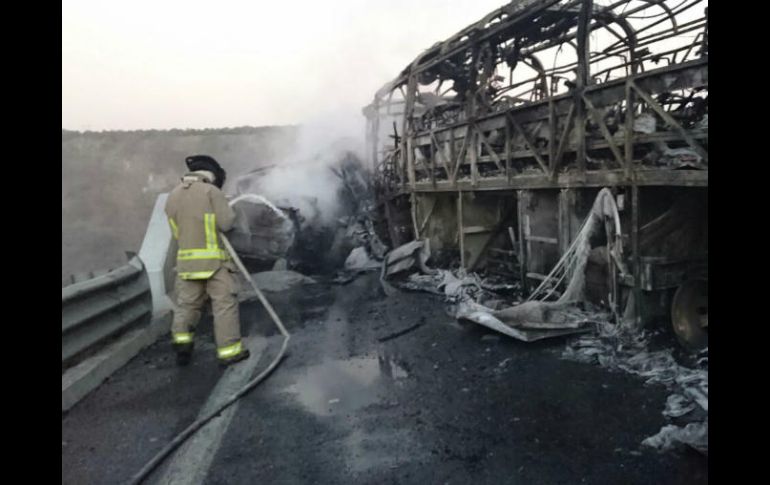 GUADALAJARA, JALISCO (28/FEB/2017).- Un autobús de pasajeros de la línea Élite chocó contra un camión de carga en la autopista Guadalajara-Colima. El percance obligó a cerrar un tramo de esa vía a la altura del kilómetro 109, en territorio del municipio de Tuxpan.Según la Unidad Estatal de Protección Civil, mientras que cinco de los 15 pasajeros requirieron atención médica, el conductor fue reportado en estado grave.Los hechos ocurrieron esta tarde cuando el autobús chocó contra el otro vehículo, un tractocamión doble remolque, que llevaba contenedores vacíos; las placas del primer contenedor eran 958-XM-4 y del segundo, 957-XM-4.Según Protección Civil, hasta el momento sólo se ha confirmado que cinco pasajeros del autobús fueron trasladados por la Cruz Roja a puestos de socorro para que recibieran atención médica, con lesiones leves.