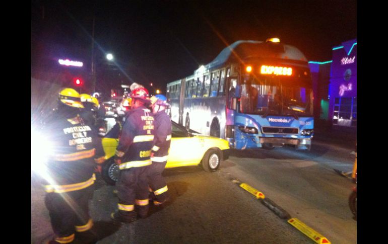 GUADALAJARA, JALISCO (18/NOV/2016).- Un taxi y una unidad del Macrobús chocaron esta noche, en hechos ocurridos en la Zona Industrial de Guadalajara en los que cuatro personas sufrieron lesiones de diversa gravedad, reportó Protección Civil y Bomberos de Guadalajara.Los hechos ocurrieron poco antes de las 20:30 en el cruce de Gobernador Curiel y la calle 11, aunque las autoridades no han precisado en qué condiciones se dio el choque.Al llegar al sitio, los bomberos encontraron con lesiones a dos personas que viajaban en el taxi del sitio 34 y a dos pasajeros de la unidad TM-035 del Macrobús.Sin embargo, poco después se informó que sólo uno de los afectados requirió atención médica: un hombre de 67 años de edad que fue llevado a la clínica 46 del Seguro Social para su valoración.