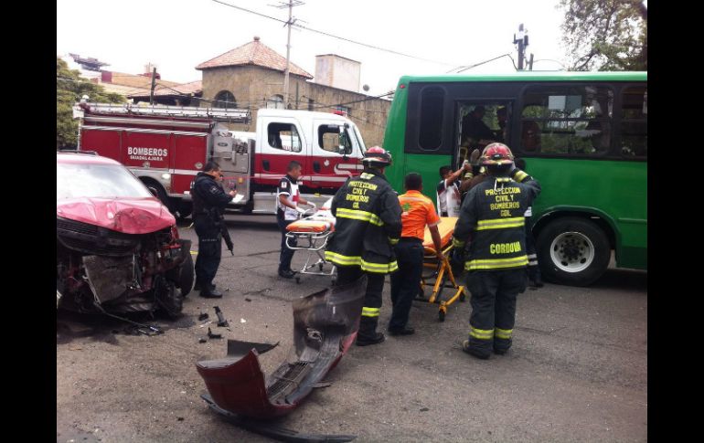 GUADALAJARA, JALISCO (08/AGO/2016).- Al mediodía de este lunes se registró el choque de una unidad del transporte público contra un automóvil particular, en Avenida de La Paz y Calderón de la Barca, dejando como resultado cuatro personas lesionadas, quienes viajaban en el autobús de la ruta 51 AB. Los lesionados fueron atendidos por personal de Cruz Roja, Protección Civil y Bomberos y Servicios Médicos, del municipio de Guadalajara, quienes los trasladaron en estado regular, con múltiples contusiones. En cuanto a los conductores ambos vehículos, un autobús con número económico S-0133 y una camioneta familiar color rojo, no requirieron traslado y permanecieron en el lugar, a la espera de que agentes de la Secretaría de Movilidad deslindara responsabilidades.