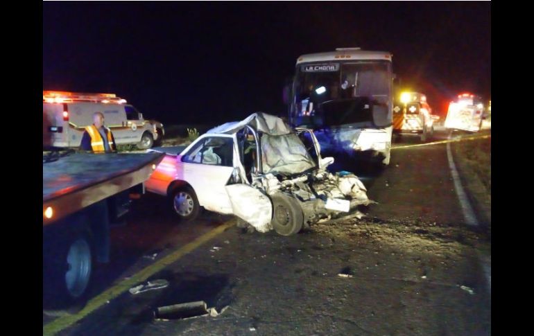 Jalisco | El impacto se dio en el km 92 en carretera a Aguascalientes Choque deja saldo de tres muertos y cuatro lesionados en Jalisco El impacto entre auto compacto y autobús se dio en el km 92 en carretera a Aguascalientes Por: NTX 24 de enero de 2016 - 12:39 hs Las tres personas que viajaban en el auto perdieron la vida en el accidente. ESPECIAL / UEPCBJ GUADALAJARA, JALISCO (24/ENE/2016).- La Unidad Estatal de Protección Civil y Bomberos de Jalisco (UEPCBJ) informó hoy que tres personas murieron y cuatro más resultaron lesionadas tras registrarse un accidente automovilístico en esta entidad. Añadió que elementos de la UEPCBJ atendieron un choque entre un automóvil compacto y un autobús de pasajeros en el kilómetro 92 de la carretera federal Encarnación de Díaz a Aguascalientes, con saldo de tres personas muertas ocupantes del coche y cuatro más lesionadas en estado regular. Recordó a la ciudadanía que antes de salir a carretera deben revisarse los niveles del vehículo, el estado mecánico y que las llantas se encuentren en buenas condiciones. Además de no manejar cansado, ni tampoco si ha ingerido sustancias tóxicas; utilizar el cinturón de seguridad y asegurarse que todos los ocupantes de su automotor los utilicen; y conducir a la defensiva y a una velocidad moderada. Temas Seguridad Accidentes Protección Civil Jalisco Carreteras Lee También Dónde ver EN VIVO Charros de Jalisco vs Águilas de Mexicali por la serie inaugural de la LMP México y Estados Unidos refuerzan cooperación en seguridad fronteriza Ratifican a Consuelo González como magistrada del Supremo Tribunal de Justicia de Jalisco Rechazan ratificar a Espinosa Licón como magistrado del Supremo Tribunal de Justicia Recibe las últimas noticias en tu e-mail Todo lo que necesitas saber para comenzar tu día Registrarse implica aceptar los Términos y Condiciones