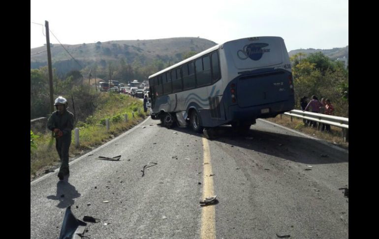 GUADALAJARA, JALISCO (29/DIC/2016).- Este jueves, se registró un choque entre un auto compacto y un autobús de pasajeros en el kilómetro 16 de la Carretera a Saltillo, informó la Unidad Estatal de Protección Civil y Bomberos de Jalisco (UEPCBJ). El percance dejó como resultado dos personas muertas, un hombre y una menor de edad, que viajaban a bordo del vehículo compacto, además de cinco pasajeros del autobús lesionados, de leves a regulares, y tres personas que viajaban en el automóvil lesionadas de gravedad. Al momento, las unidades de Protección Civil y Bomberos de Jalisco y de Zapopan apoyan en el lugar.