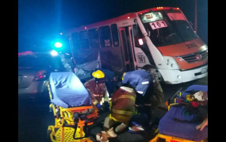 GUADALAJARA, JALISCO (20/FEB/2017).- Un auto compacto chocó contra un camión urbano en un accidente que esta noche produjo que al menos cinco personas sufrieran heridas, una de ellas grave. Los hechos ocurrieron poco antes de las 21:00 horas en la Carretera a Colotlán, en el kilómetro 9.5, a la altura del ingreso a Hacienda Copala. Según los primeros datos recabados por Bomberos de Zapopan, el camión del transporte público, de la ruta 161, estaba por utilizar este ingreso cuando el auto compacto se le impactó por un lado. El carro es un Nissan Altima color gris, que presentó fuertes golpes en la parte frontal. A bordo viajaban dos varones, uno de los cuales, que iba en el asiento del copiloto, sufrió lesiones de gravedad. Entre los pasajeros del camión, sufrieron lesiones de leves a regulares dos mujeres adultas --de 63 y 28 años de edad-- y dos niños, de cuatro años y un año de edad. Todos ellos recibieron atención médica en el lugar y fueron trasladados a puestos de socorros. Los dos conductores quedaron detenidos para que el Ministerio Público determine su responsabilidad en lo ocurrido.