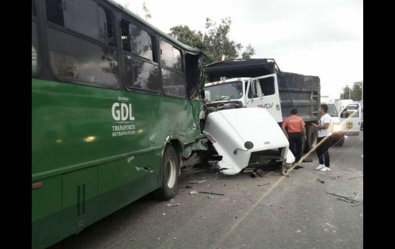 GUADALAJARA, JALISCO (10/AGO/2017).- La tarde-noche de este jueves se registró un choque entre un camión de volteo y una unidad de la ruta 380 del transporte público. El accidente ocurrió sobre Periférico Sur y López Mateos.Por el percance, al menos 11 personas resultaron lesionadas, con heridas de leves a regulares. Los heridos ya fueron enviados a Cruz Verde Las Águilas y la Cruz Verde Norte para su atención médica.De acuerdo con testigos, el camión de la 380 fue impactado en la parte trasera por el camión de volteo.El accidente provoca el cierre del carril derecho, lo que ocasiona tráfico en la zona.