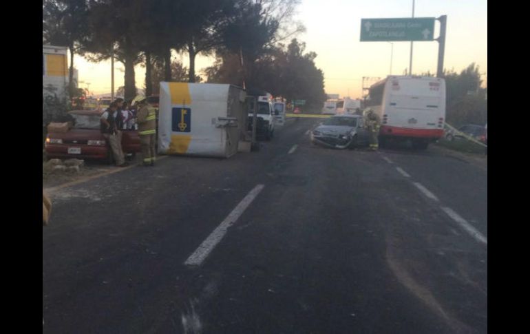 GUADALAJARA, JALISCO (05/ENE/2017).- La tarde de este jueves se registró un choque múltiple entre cuatro vehículos en la carretera a Chapala, 200 metros antes del Aeropuerto Internacional de Guadalajara. El percance entre dos vehículos compactos, un camión urbano de la ruta 176 y uno de doble remolque de la compañía Coppel dejó como saldo seis lesionados, según reportó Protección Civil Estatal. Como resultado del accidente, uno de los remolques del vehículo de carga de Coppel terminó volcado, por lo que hasta las 19:00 horas algunos carriles de la carretera que conduce al aeropuerto permanecen cerrados para atender el choque.El reporte requirió el apoyo de diversas corporaciones, como la Cruz Verde de El Salto y la Policía de Tlajomulco.Las autoridades determinarán las causas y los responsables del accidente.