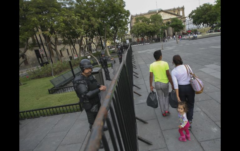 Jalisco | Marcha de padres de normalistas provoca operativo y cierres viales en el Centro tapatío Colocan vallas y antimotines por caravana de Ayotzinapa La marcha de los padres de los normalistas provoca un operativo de vigilancia y cierres viales en el Centro tapatío Por: EL INFORMADOR 18 de noviembre de 2014 - 17:04 hs Elementos de seguridad y vallas resguardan el Congreso de Jalisco y Palacio de Gobierno. EL INFORMADOR / F. Atilano GUADALAJARA, JALISCO (18/NOV/2014).- Si no tiene nada qué hacer en el centro de la ciudad, en lo que resta de este martes, mejor no se acerque. La visita de los padres de los 43 normalistas desaparecidos en Guerrero ha ocasionado que la autoridad corte la circulación en algunas vialidades principales y monte un operativo de vigilancia con policías estatales y antimotines. Desde temprana hora, un grupo de uniformados resguardan la sede del poder legislativo. Alrededor de 50 elementos vestidos para entrar en contacto son los que vigilan las inmediaciones del Congreso del Estado. Además, se ha cortado la circulación en la calle Independencia, desde la Calzada Independencia; y la avenida Hidalgo, desde su cruce con avenida Alcalde. Las obras de rehabilitación de las calles aledañas a la plaza Liberación también fueron aseguradas con vallas que rebasan los dos metros de altura y que son custodiadas por personal de la Fiscalía General del Estado. También los pasos peatonales han sido restringidos, como en los andadores Morelos y Pedro Moreno, que son las calles que circundan el Palacio de Gobierno, al igual que la calle Maestranza y Ramón Corona. Éstas últimas han sido cerradas desde días antes, por la construcción de calles y banquetas para el proyecto de Bici Pública. Hasta el momento se tiene programada una manifestación que caminará desde la Glorieta de La Normal con rumbo a la Plaza de Armas. El quiosco de dicha plaza ya tiene mantas en apoyo a los padres de familia que desde hace más de 50 días desconocen el paradero de sus hijos. La invitación que se hizo es para participar en una protesta pacífica. Aunque más discreta, la Policía de Guadalajara mantiene por lo menos seis patrullas apostadas en la parte norte del Palacio municipal. EL INFORMADOR / OMAR GARCÍA Temas Manifestaciones en Jalisco Municipios Guerrero Calles y vialidades de Guadalajara Desapariciones y denuncias Lee También Morena Jalisco respalda Reforma Judicial Comienza en Jalisco la Campaña Nacional de Vacunación de invierno Charros de Jalisco buscará frenar su racha negativa en juegos inaugurales de la LMP Autos con estas placas deben realizar la Verificación Vehicular antes del 31 de octubre Recibe las últimas noticias en tu e-mail Todo lo que necesitas saber para comenzar tu día Registrarse implica aceptar los Términos y Condiciones