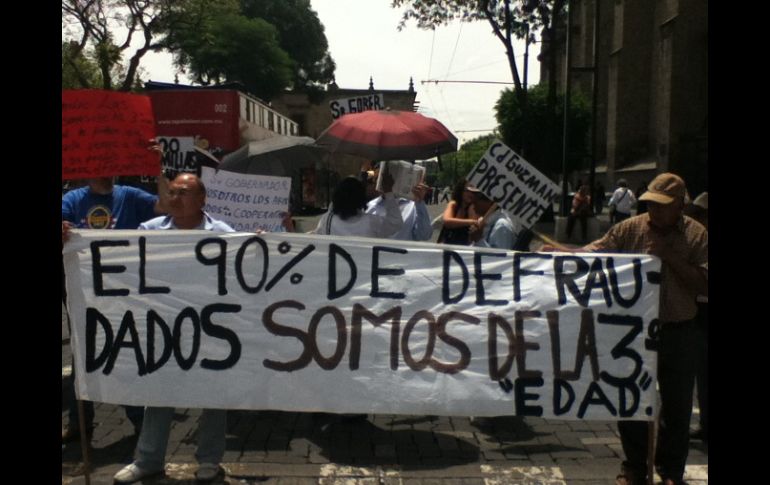 Jalisco | La Cooperativa funcionaba a nivel nacional Defraudados afectan circulación vial por bloqueo en calles del Centro Piden al gobernador firme documento que permite el regreso de un porcentaje de su dinero Por: EL INFORMADOR 30 de junio de 2011 - 12:50 hs La mayoría de los afectados fueron adultos mayores que depositaron sus ahorros en la caja popular. R. GIL / GUADALAJARA, JALISCO (30/JUN/2011).- Ciudadanos que exponen haber sido defraudados por una caja popular de ahorros se manifestaron esta tarde en arterias del Centro de la capital jalisciense, para pedirle al gobernador del Estado, Emilio González, firme un documento que avale la devolución de un porcentaje de su dinero perdido. Durante las 12:00 horas de este jueves, cerca de 60 personas tomaron la avenida Hidalgo, obstruyendo el paso vehicular, salvo a los autobuses de transporte público, para hacerse notar ante las autoridades del Palacio de Gobierno, ya que necesitan la firma de Emilio González Márquez para que se autorice el pago de aproximadamente 20 millones de pesos, los cuales perdieron al ahorrar dentro de la Cooperativa de Vivienda Popular Juntos Organizados Venceremos. La Secretaría de Vialidad y Transporte (SVyT) reportó afectaciones en el tráfico vehicular a raíz de la manifestación, en la Avenida Hidalgo a su cruce con Alcade. Según refieren habitantes de Ciudad Guzmán y demás manifestantes, el Gobierno tiene la obligación de ver por ellos ante esta problemática, ya que acreditaron el funcionamiento de la caja popular. Cerca de las 12:30 horas, un miembro del personal del Palacio de Gobierno salió para dialogar con los manifestantes, llegando así a un acuerdo para que una comisión ingresara a las instalaciones y expusiera la problemática. También mencionaron que han obtenido cerca de 35 millones de pesos gracias al Gobierno federal, y que son cerca de mil 700 familias, solamente de Jalisco, las que han sido afectadas por este fraude, sin contar las pertenecientes a otros estados, ya que la caja funcionaba a nivel nacional. Minutos antes de arribar a la Avenida Hidalgo, los defraudados se reunieron en las vialidades de Ramón Corona y Pedro Moreno, donde tuvieron la oportunidad de encontrarse con el diputado Jesús Casillas, quien prometió escucharlos a las 14:30 horas en el Congreso. EL INFORMADOR / RUBÉN GIL Temas Manifestaciones en Jalisco Vialidad Palacio de Gobierno Recibe las últimas noticias en tu e-mail Todo lo que necesitas saber para comenzar tu día Registrarse implica aceptar los Términos y Condiciones