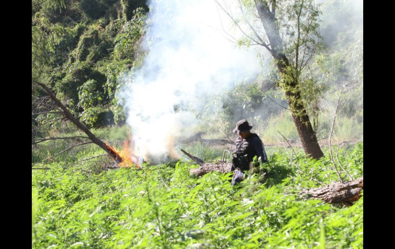GUADALAJARA, JALISCO (22/AGO/2016).- Elementos de la Fuerza Única Jalisco localizaron y destruyeron un poco más de 150 mil plantas de mariguana durante operativos de vigilancia realizados el pasado 18 de agosto en el municipio de Tequila.Los policías estatales localizaron siete extensiones de terreno sembradas con el enervante cerca de la brecha que conduce a la comunidad de El Olvido, ubicada aproximadamente a ocho kilómetros de la población de El Salvador, en el citado municipio.En total, los sembradíos tenían una extensión de 26 mil 600 metros cuadrados, con aproximadamente 106 mil 400 plantas, con un altura promedio de entre 80 y 120 centímetros.Además, encontraron otras seis extensiones con un total de 12 mil metros cuadrados y con aproximadamente 48 mil plantas, con un altura promedio de entre 100 y 120 centímetros.