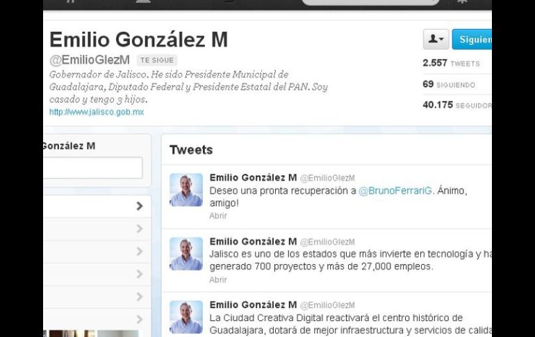 Jalisco | Ambos personajes tenían previsto reunirse esta tarde en la ciudad de México Emilio desea pronta recuperación a Bruno Ferrari Ambos personajes tenían previsto reunirse esta tarde en la ciudad de México para encabezar la presentación del plan maestro de Guadalajara, Ciudad Creativa Digital Por: EL INFORMADOR 20 de noviembre de 2012 - 18:21 hs El tuit del Gobernador del Estado fue una de las primeras reacciones oficiales en conocerse. ESPECIAL TWITTER / GUADALAJARA, JALISCO (20/NOV/2012).- "Deseo una pronta recuperación a @BrunoFerrariG. ¡Ánimo, amigo!", escribió el gobernador de Jalisco, Emilio González Márquez, en una de las primeras reacciones oficiales tras conocerse que el titular de la Secretaría de Economía fue hospitalizado para ser atendido de una trombosis. Ambos personajes tenían previsto reunirse esta tarde en la ciudad de México para encabezar la presentación del plan maestro de Guadalajara, Ciudad Creativa Digital. De último momento, el Ejecutivo Estatal canceló su participación debido a cuestiones de salud, según confirmó el secretario de Promoción Económica de Jalisco, Jaime Eduardo Martínez. Por lo anterior, el evento protocolario se realiza sin la asistencia de ninguno de los dos servidores públicos, pero sin mayores cambios. EL INFORMADOR / SERGIO RODRÍGUEZ Temas Gobierno del Estado Emilio González Bruno Ferrari Lee También Sheinbaum afirmó que Ebrard buscará evitar imposición de aranceles en su visita a EU Así se ve la carretera Guadalajara-Morelia en cámaras del C5 tras bloqueo Jetour Soueast Guadalajara inaugura frente a Plaza Galerías Interviene el Gobierno del Estado en protesta de maiceros para liberar carreteras Recibe las últimas noticias en tu e-mail Todo lo que necesitas saber para comenzar tu día Registrarse implica aceptar los Términos y Condiciones