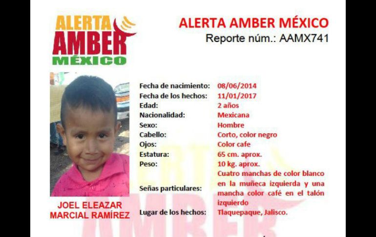 GUADALAJARA, JALISCO (12/ENE/2017).- Este jueves fue emitida la Alerta Amber en Jalisco por un menor de dos años, que desapareció en Tlaquepaque el pasado 11 de enero.De acuerdo con la ficha emitida, Joel Eleazar Marcial Ramírez, fue visto por última vez el 11 de enero en las inmediaciones de una plaza comercial ubicada en Periférico Sur y Avenida Colón, en el citado municpio.Se considera que la integridad del niño se encuentra en peligro ya que puede ser víctima de algún delito.Para cualquier información que pueda llevar a su paradero, favor de comunicarse a los números (01) 3330304949 en Jalisco, y al 01 800 0085400 en el interior de la República.