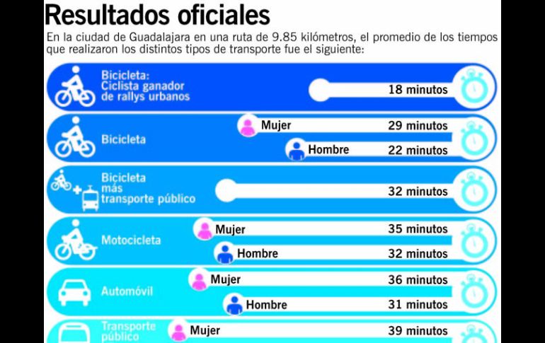 Jalisco | Realizan Desafío Modal en Guadalajara En 12 ciudades muestra la bici su eficiencia En un recorrido de casi 10 kilómetros fue el medio de transporte más eficiente, al concluir el trayecto en el menor tiempo Por: EL INFORMADOR 23 de noviembre de 2012 - 03:49 hs El Desafío Modal,realizado ayer en Guadalajara,ubicó a la bicicleta como el medio más rápido de transporte en un trayecto de 9.85 km / GUADALAJARA, JALISCO (23/NOV/2012).- El Desafío Modal, realizado ayer en Guadalajara, ubicó a la bicicleta como el medio más rápido de transporte en un trayecto de 9.85 kilómetros. La capital jalisciense se convirtió en la doceava urbe del país en la que el velocípedo demostró mayor eficiencia respecto a otros modos de traslado. No son carreras, será un traslado cotidiano en el que, eso sí, tendrán que respetarse las normas viales. Fueron indicaciones para los participantes en el ejercicio, mediante el cual organizaciones ciudadanas gestionan que se etiquete 5% del presupuesto federal 2013 que se destina al transporte y accesibilidad urbana, para proyectos de movilidad no motorizada. A alrededor de las 8:35 horas partieron los viajeros del Centro de Zapopan, del cruce de Corregidora y Abasolo, el destino: al corazón de Guadalajara, Plaza Tapatía. Los recorridos se cronometraron y hubo un registro de velocidades e incidencias del trayecto. Los participantes en el reto partieron al mismo tiempo en bicicleta, auto, motocicleta, transporte público y la combinación bicicleta-transporte público. Los dos ciclistas fueron los primeros en llegar al destino, cada uno utilizó rutas distintas. Óscar Ramos, quien avanzó por Hidalgo-Ávila Camacho-ciclovía de Federalismo e Hidalgo, consumió 22 minutos en su pedaleó; mientras Mariel Rivera, quien varió su trayecto circulando por Alcalde en lugar de Federalismo, tardó 29 minutos en llegar a su destino. En el último sitio arribaron los usuarios del transporte público, con 39 y 49 minutos; en el primer caso la joven utilizó la ruta 631 y las líneas 1 y 2 del Tren Ligero; en el segundo, el muchacho abordó la ruta 275. Óscar Ramos, el ciclista que efectuó el trayecto en menos tiempo, consideró que el ejercicio demuestra que la bicicleta es una buena opción de traslado en la ciudad, por lo que lanza un llamado a las autoridades para que implementen la primera etapa del Plan Maestro de Movilidad no Motorizada. El joven recomendó a los tapatíos realizar un uso racional del auto particular, combinando el vehículo con otros modos de traslado. “Tiene que usarse poco a poco la bici, irse acostumbrando; lo que esperamos es no dejar de usar el automóvil, es sólo usarlo para lo necesario (trayectos largos)”. En su pedalear a lo largo de los aproximadamente 10 kilómetros, una constante fue la presión de la que fue objeto por parte de automovilistas y choferes del transporte público; y en la ciclovía de Federalismo, la falta de respeto del área por parte de peatones y automovilistas, relató. “Una conclusión preliminar, porque hay que esperar al análisis del Instituto Mexicano del Transporte, es que la bicicleta es un medio de transporte muy eficaz”. Indicó que se demuestra que el transporte público no es un medio tan eficiente en tiempos. La reflexión sería en el sentido de analizar por parte de las autoridades, cuáles son las acciones a aplicar para mejorar su operación ya que por ese medio se realizan casi tres millones de viajes al día en la metrópoli. La información se entregará al Instituto Mexicano del Transporte, el cual realizará un análisis sobre cuál es el vehículo más eficiente en las ciudades. El Desafío Modal promovido por BiciRed, se realizó la semana pasada a nivel nacional, quedó pendiente en Guadalajara por el paro camionero por lo que se efectuó ayer por la mañana. EL DATOPanorama nacional De las 21 ciudades del país que reportaron datos preliminares del Desafío Modal, en 12 la bicicleta fue la primera en llegar en cinco fue la motocicleta y en las cuatro restantes fue el auto. Temas Vialidad Movilidad urbana Ciclovía Lee También ¿Es ilegal tener vidrios polarizados en México? Paquetazo 3×1: Confirman MULTA para quienes no hagan cambio de placas a tiempo Preferencia y circulación Romería de la Virgen de Zapopan 2025: cierres viales, transporte y operativo de seguridad Recibe las últimas noticias en tu e-mail Todo lo que necesitas saber para comenzar tu día Registrarse implica aceptar los Términos y Condiciones
